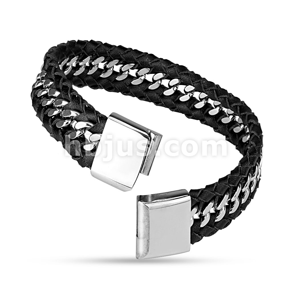 Steel Chain Centered Leather Bracelet With Large Engravable Slide In Clasp