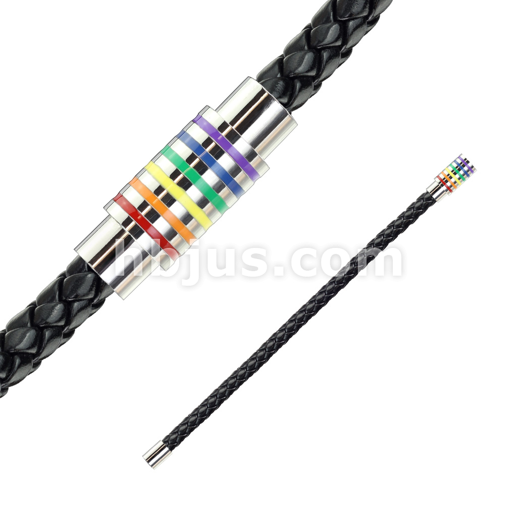 Black Braided Leather Bracelet with Magnetic Rainbow Striped Closure