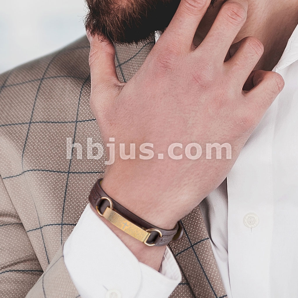 Rose Gold Lord Prayer Plate Tan Leather Bracelet with Buckle Style Closing