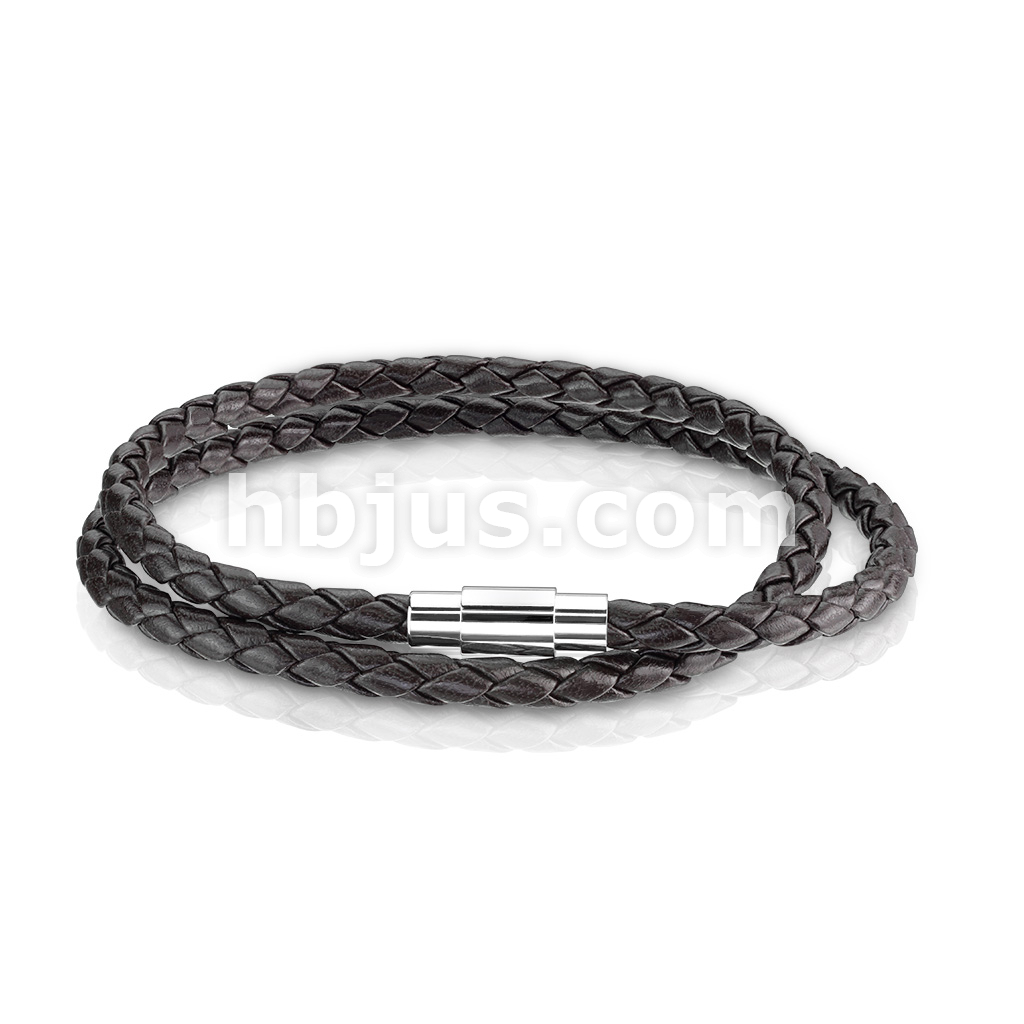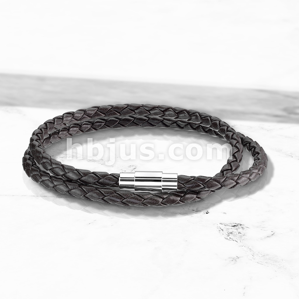 Double Wrap Dark Brown Bolo Braided Cord Magnetic Stainless Steel Clasp Leather Bracelet