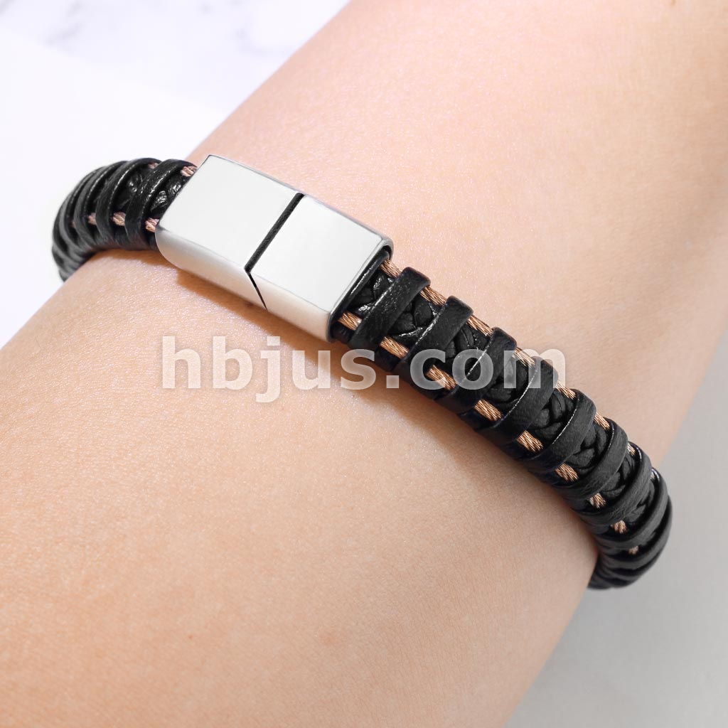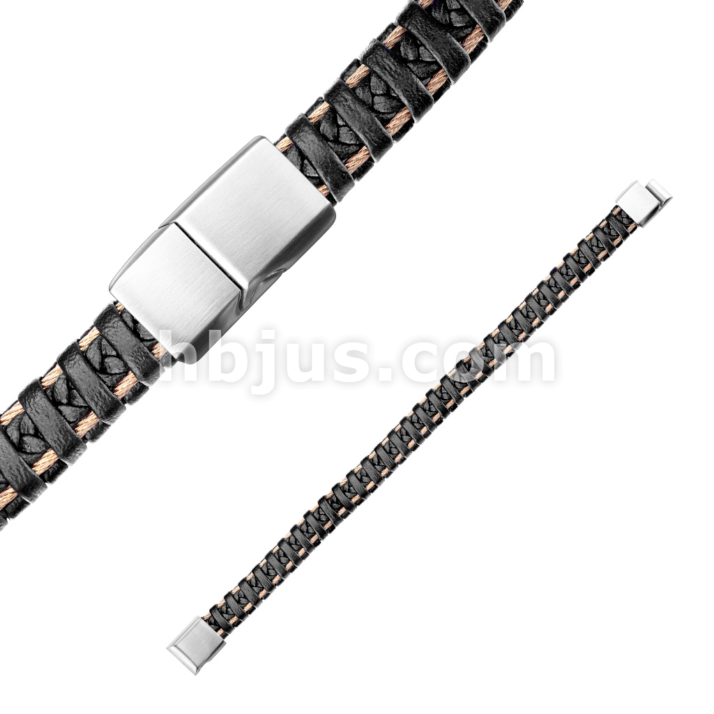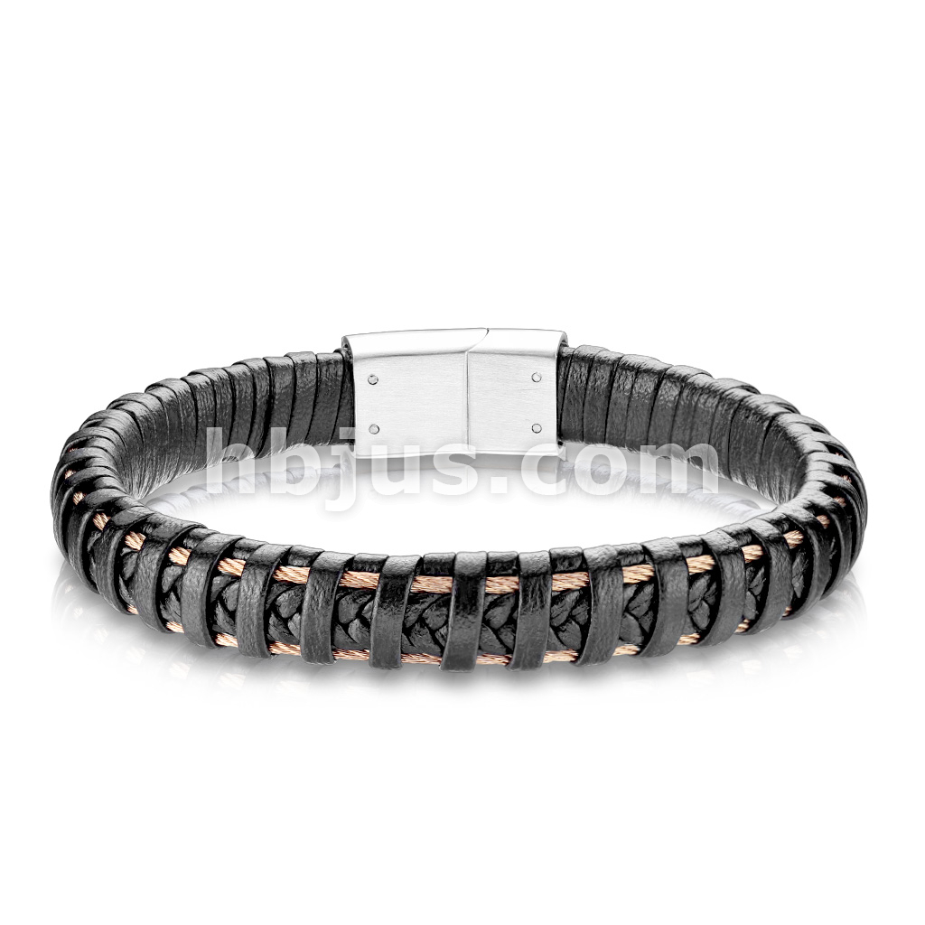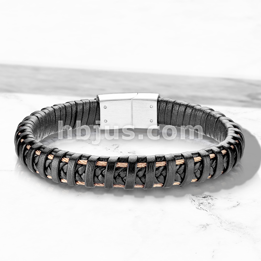 High Quality Black Micro Fiber Leather and PVD Rose Gold Stainless Steel Mens Bracelets
