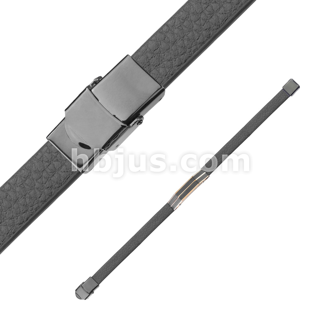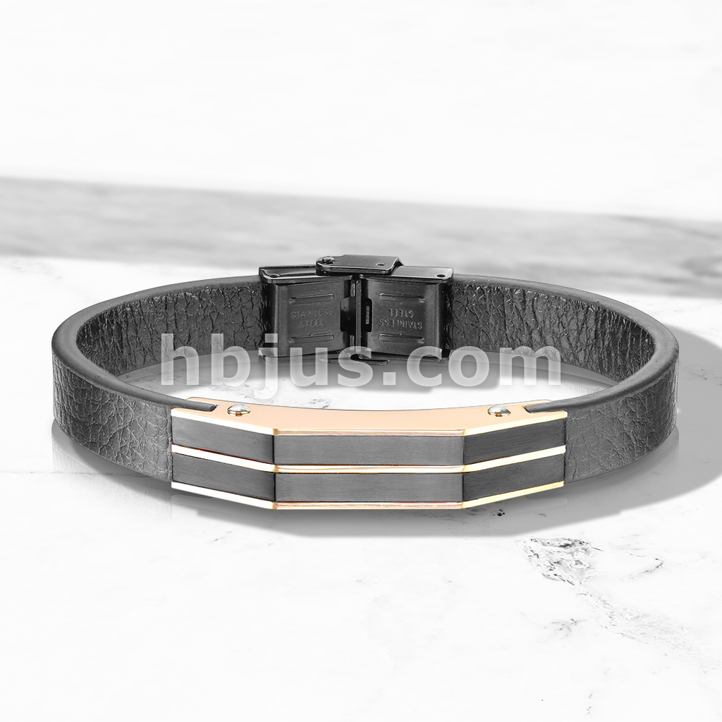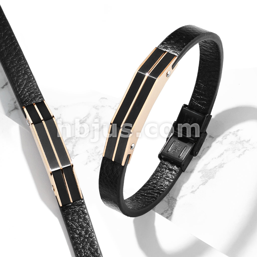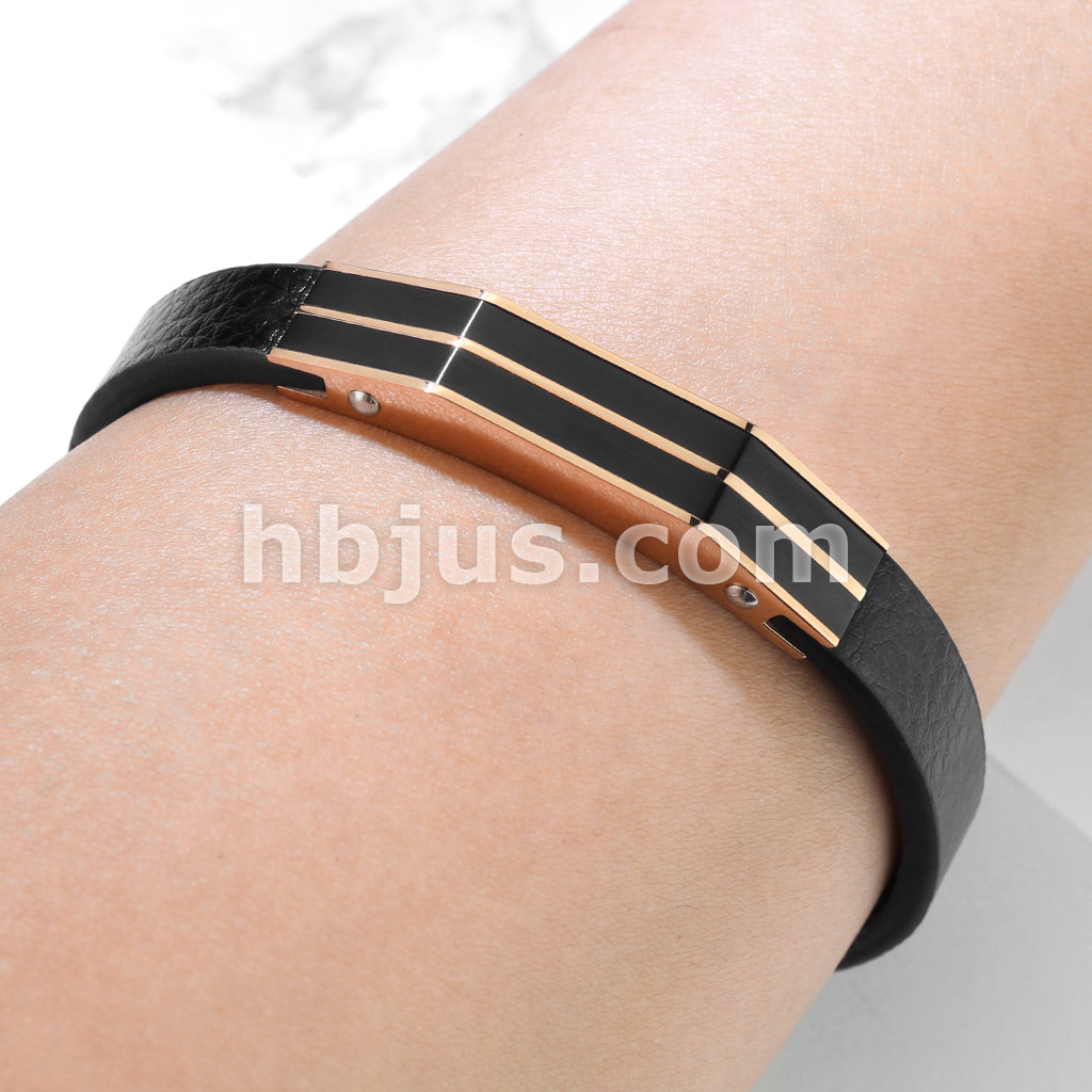 High Quality Flat Black Micro Fiber Leather and Rose Gold PVD On Black Stainless Steel Mens Bracelets