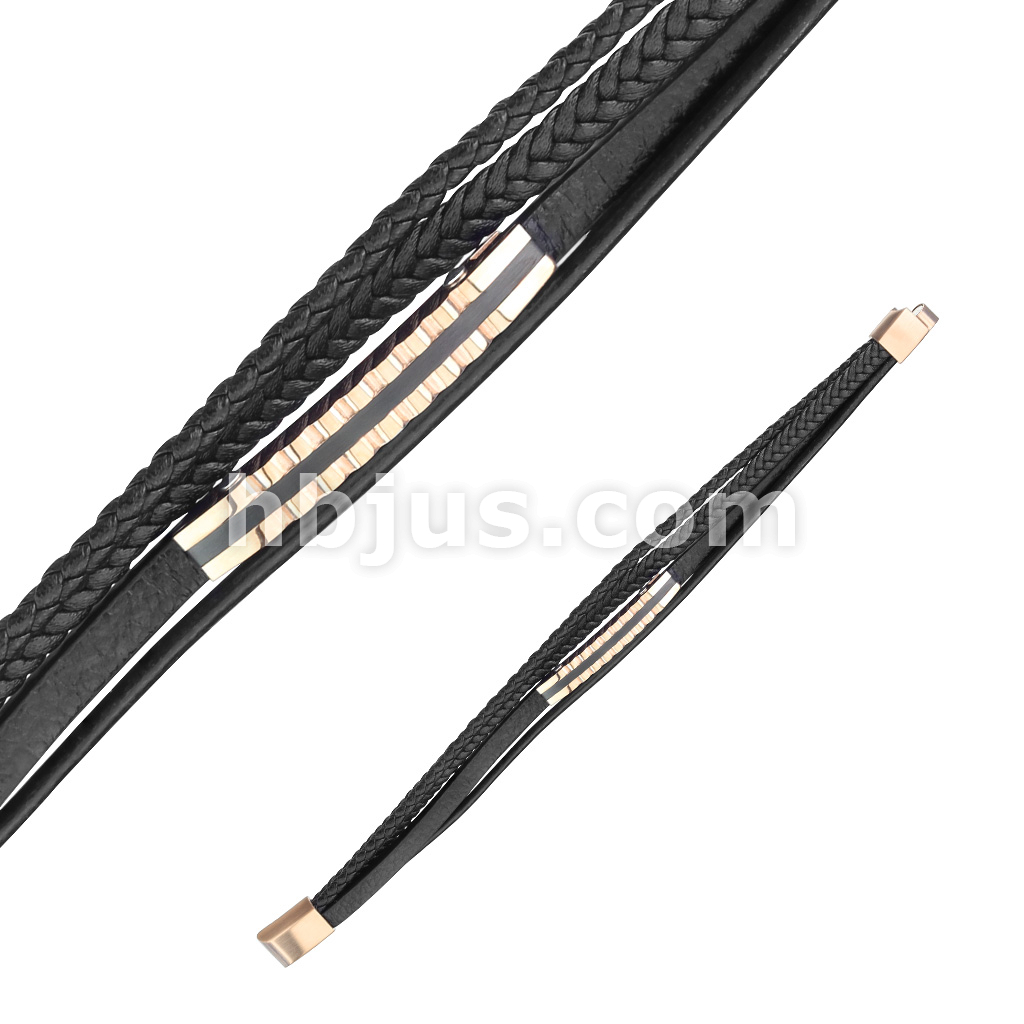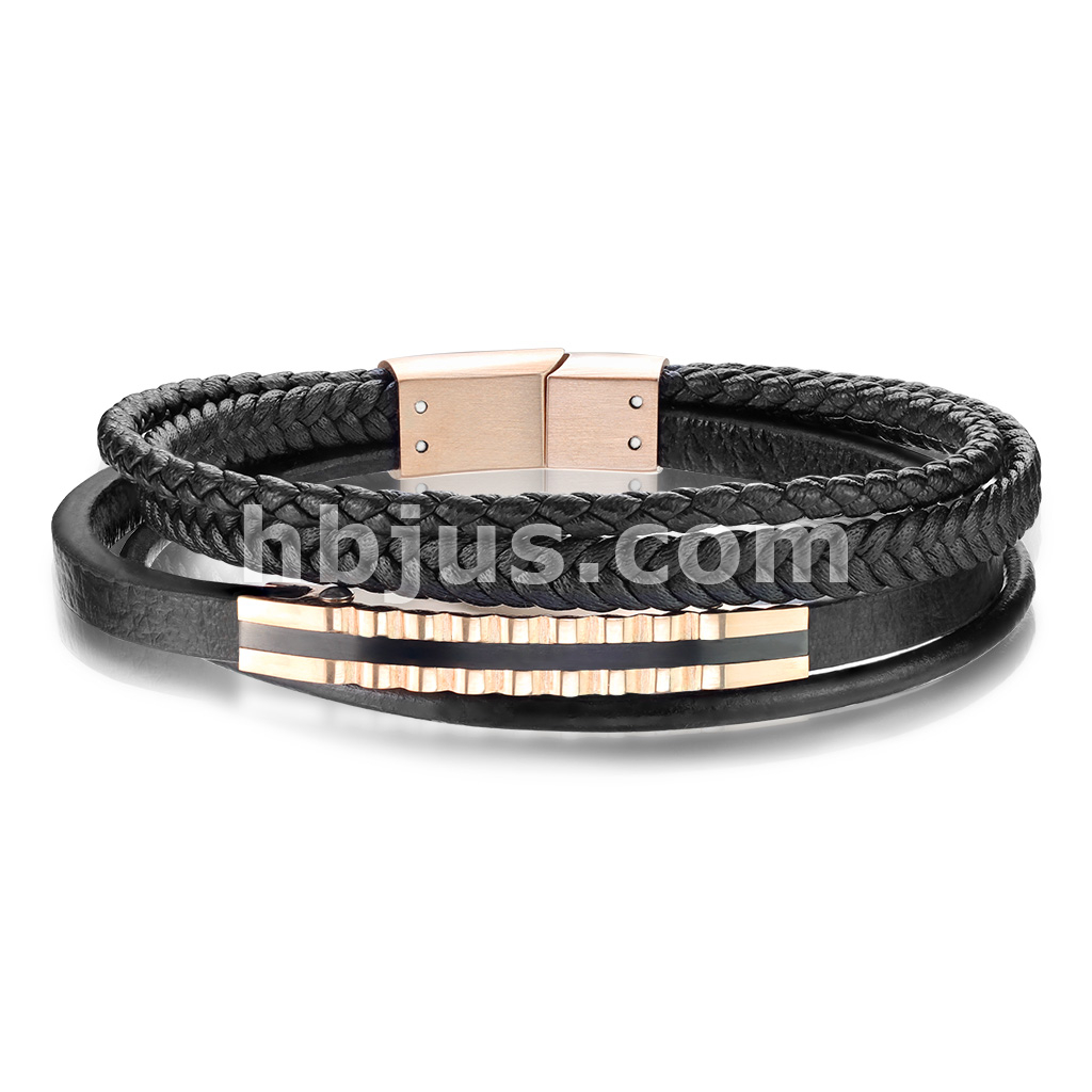 High Quality Multi Strand Black Micro Fiber Leather and Rose Gold PVD Stainless Steel Mens Bracelets