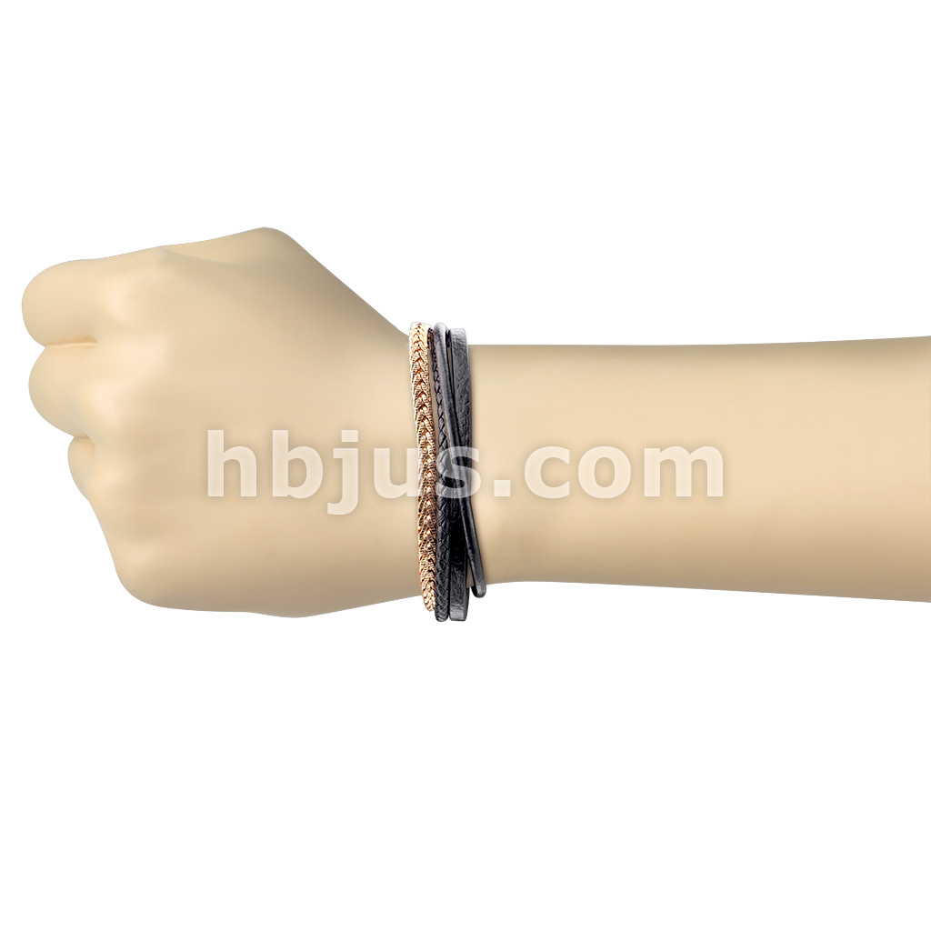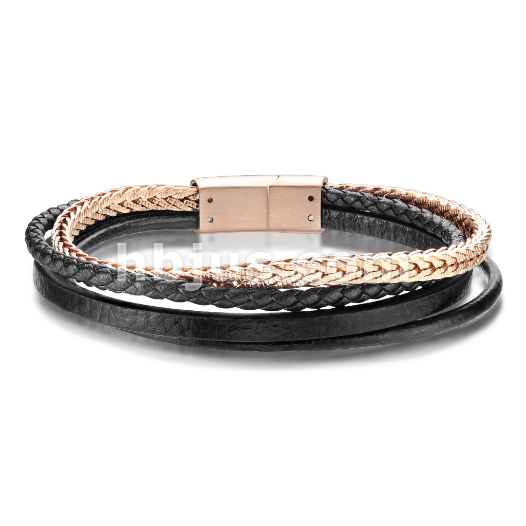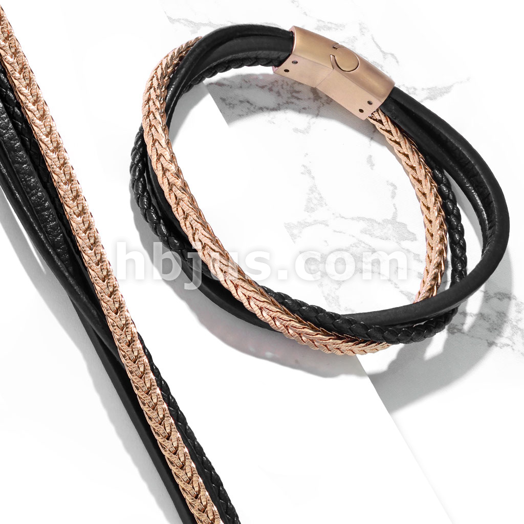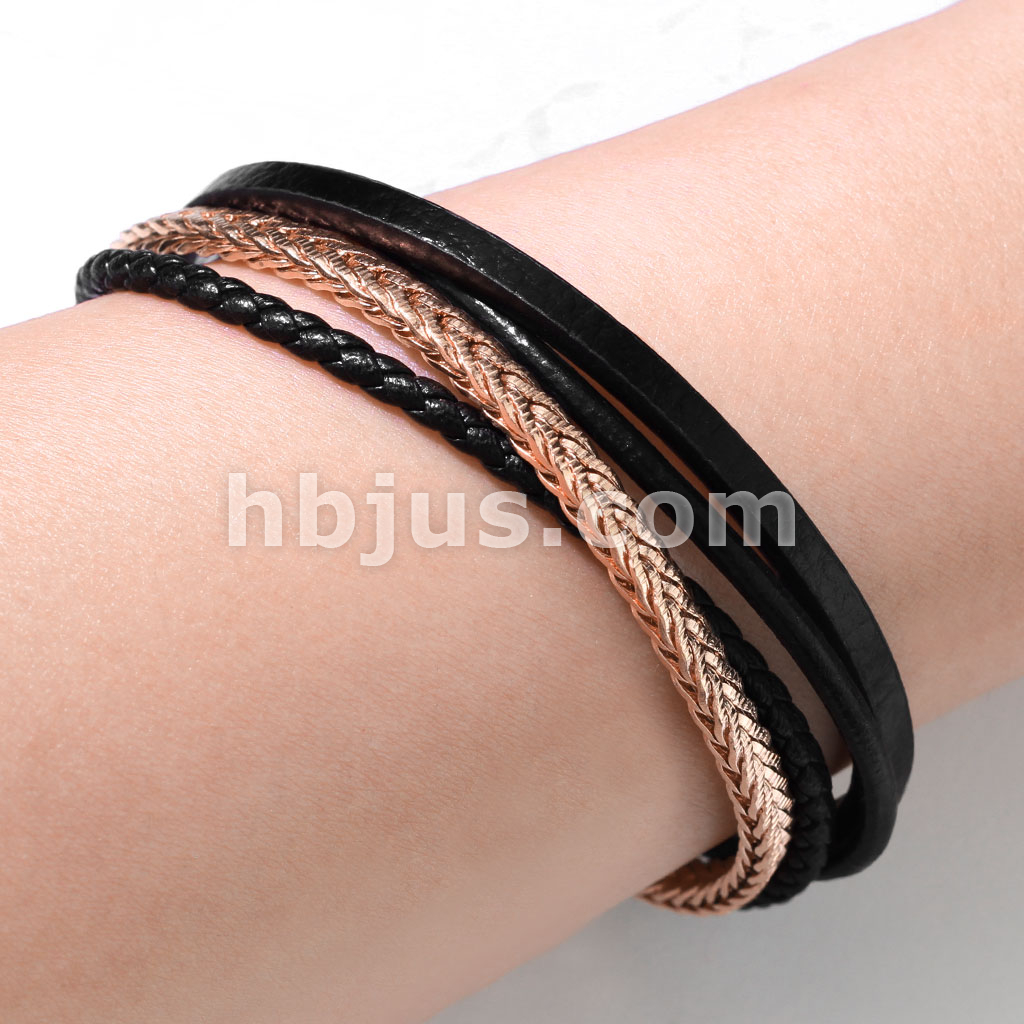 High Quality Multi Strand Black Micro Fiber Leather and Rose Gold PVD Stainless Steel Chain Unisex Bracelets
