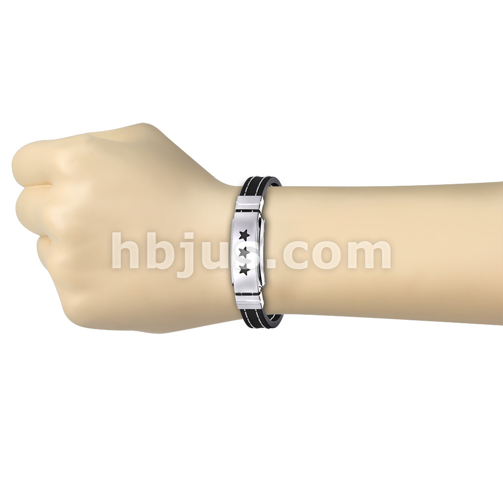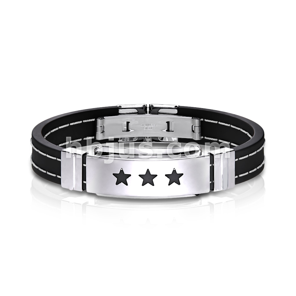 Triple Stars 316L Stainless Steel ID Plate Stitch Accent Rubber Straps Bracelet