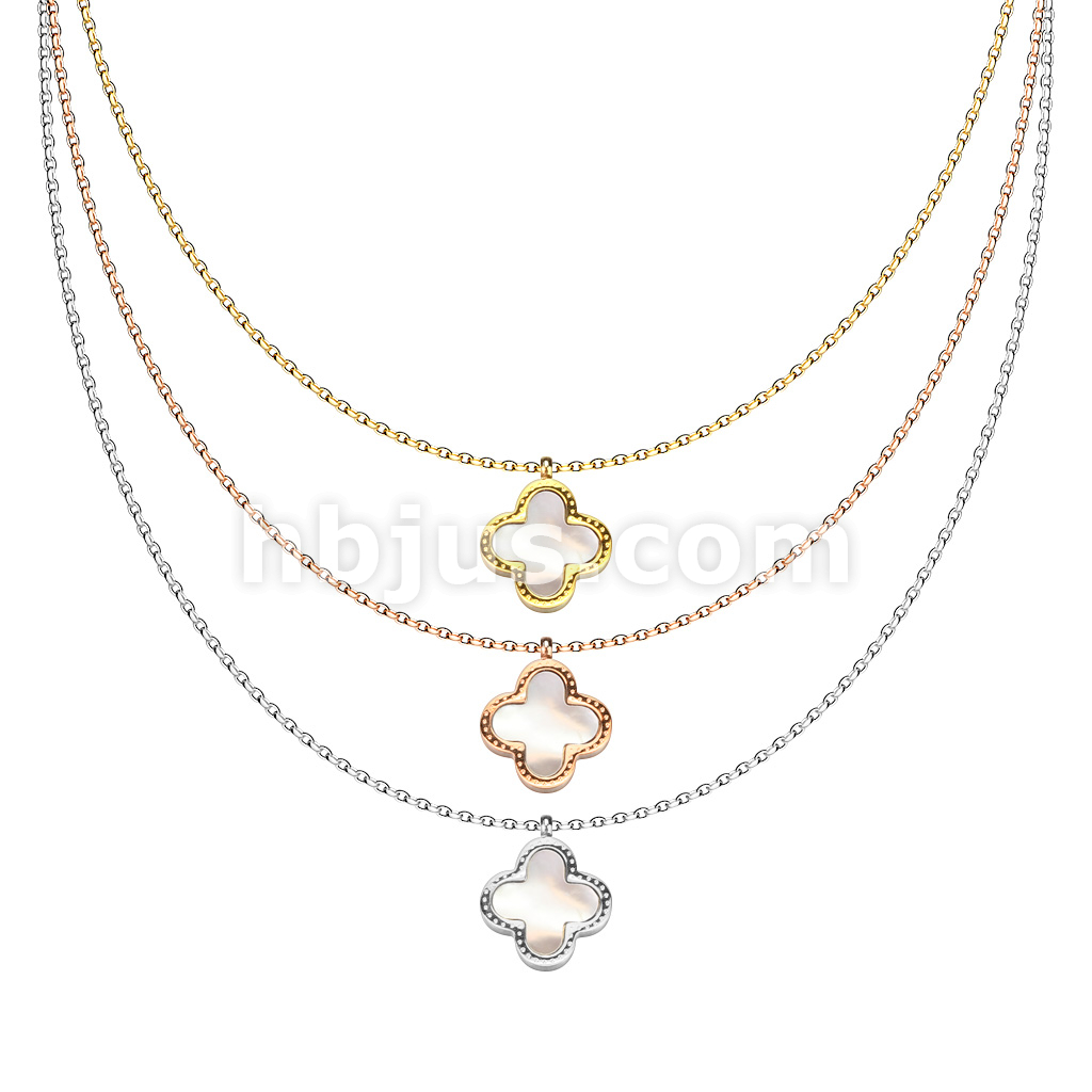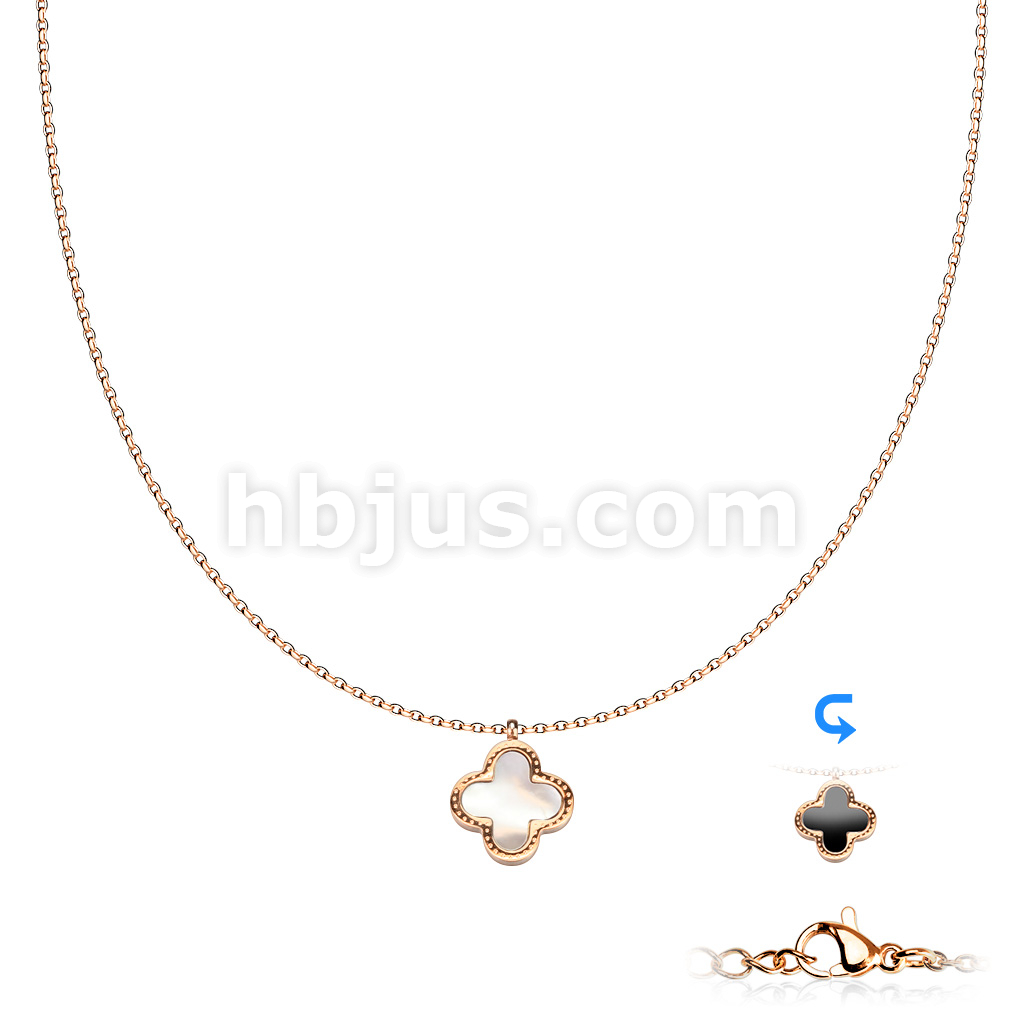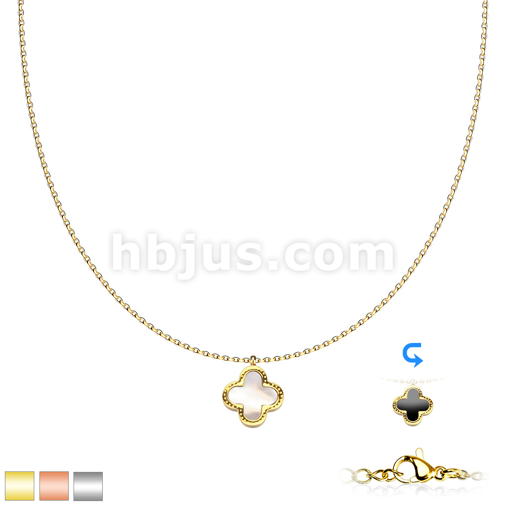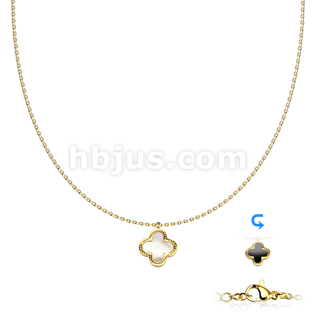 Double Faced Lucky Shamrock Pendant with Shell and Black Enamel filled back Chain Necklace