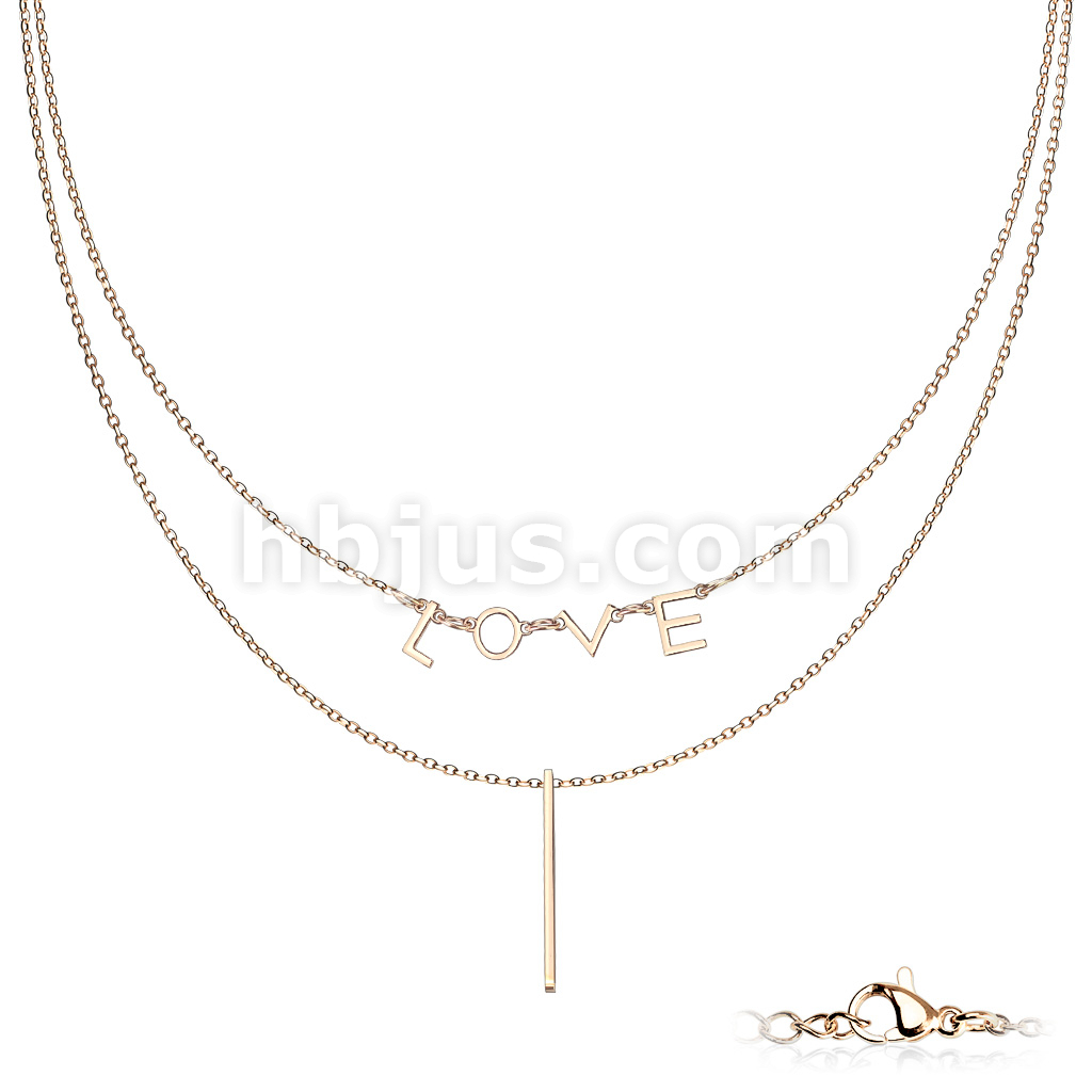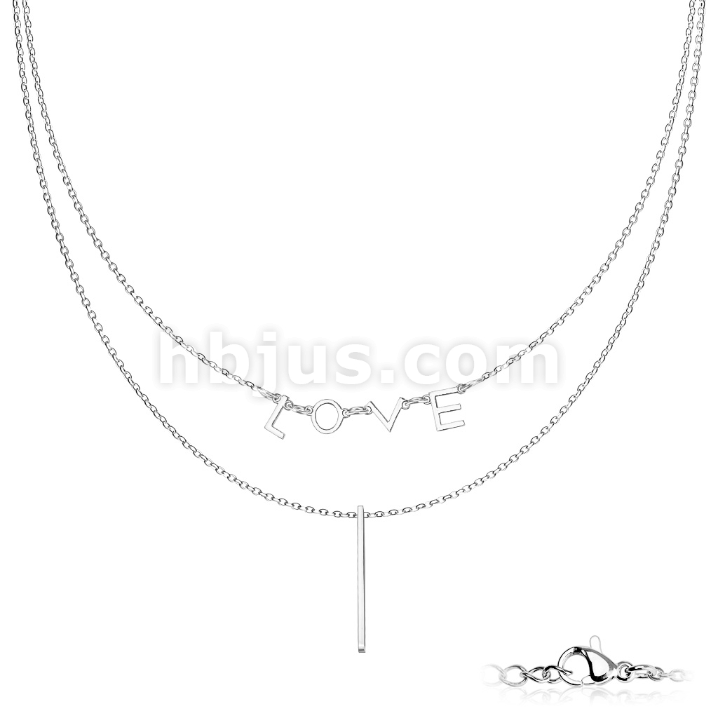Rectangular Bar and "LOVE" Charm on Double Layered Stainless Steel Chain Necklace