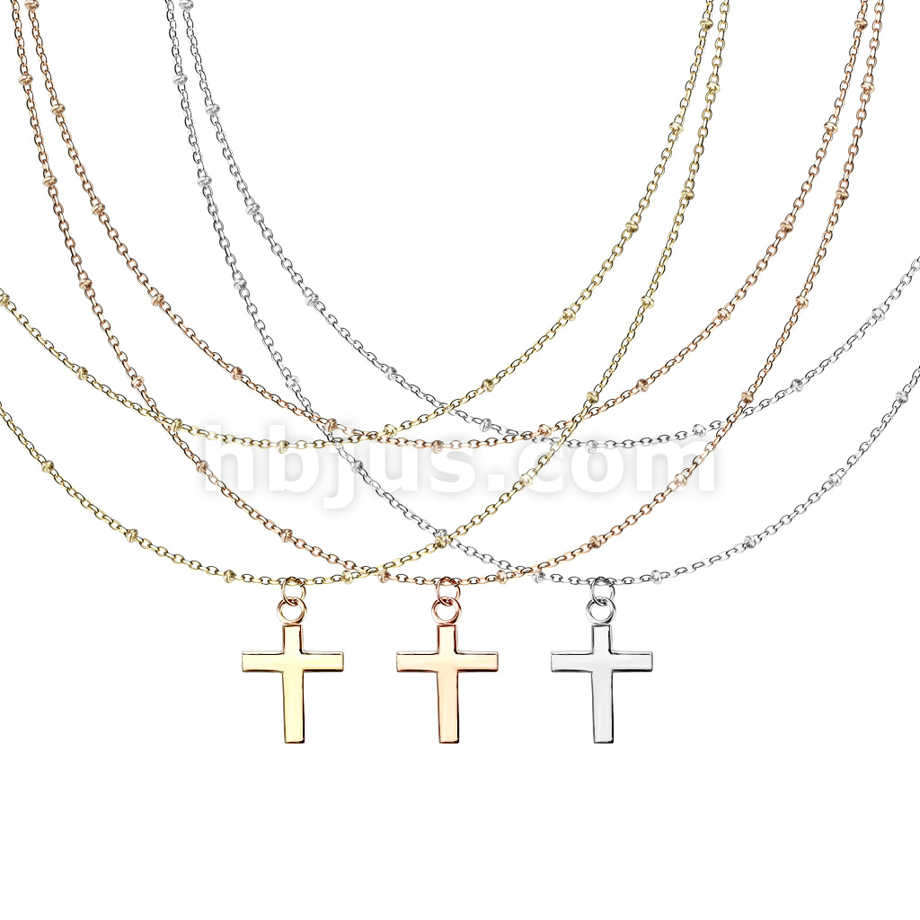 Cross Pendant with Petite Beads on Double Layered Stainless Steel Chain Necklace