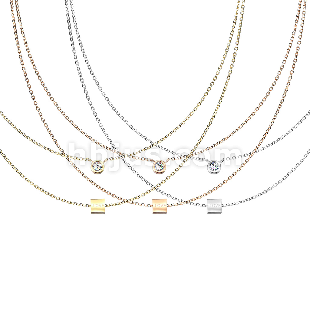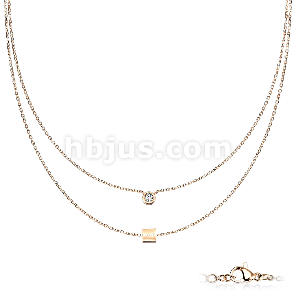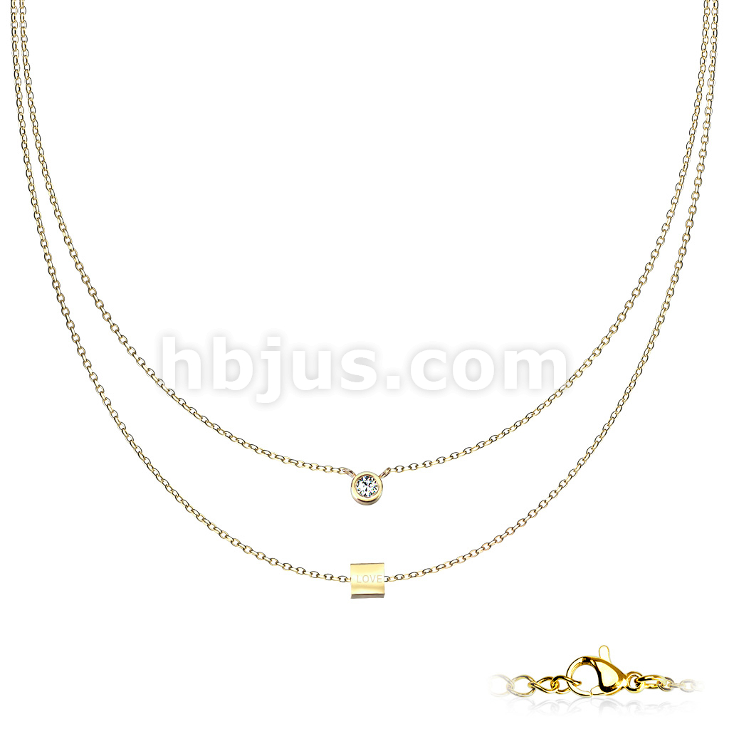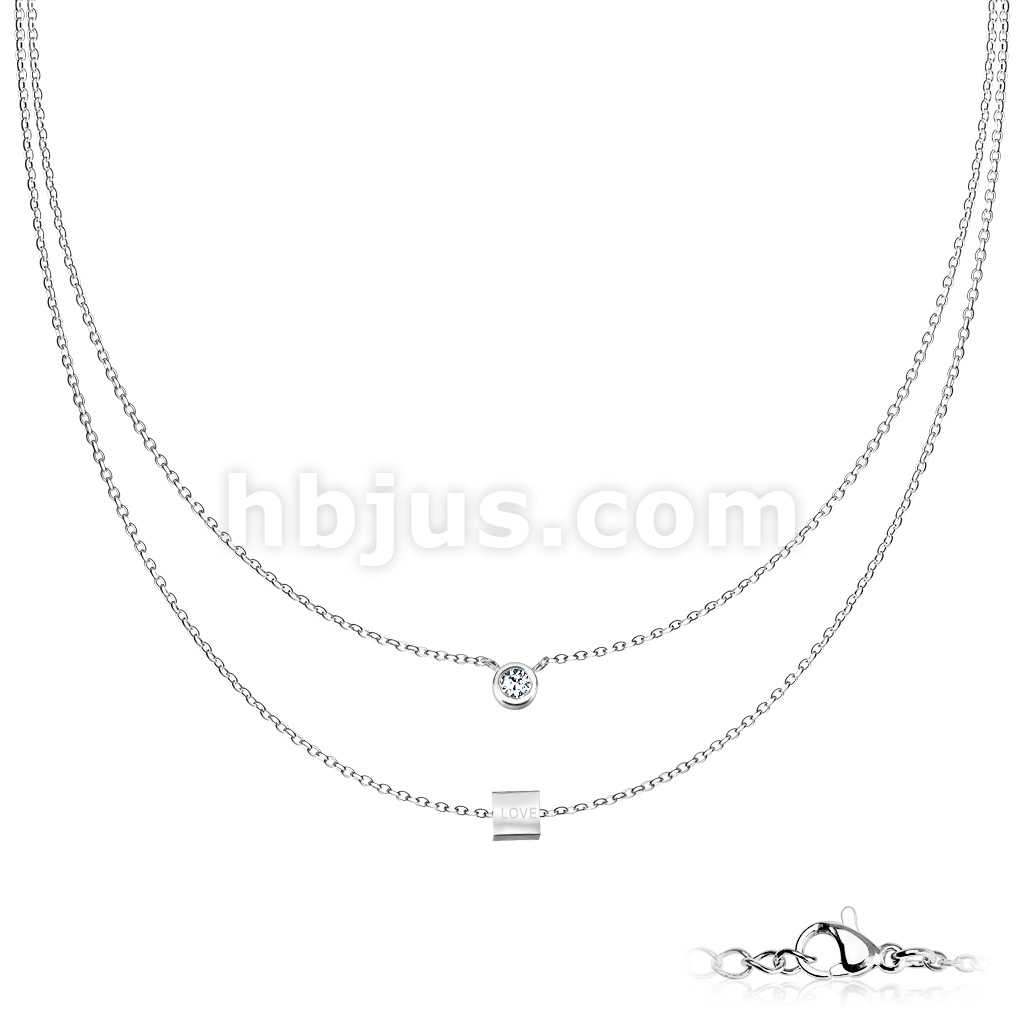 Bezel Set Gem and Cube Pendant on Double Layered Stainless Steel Chain Necklace