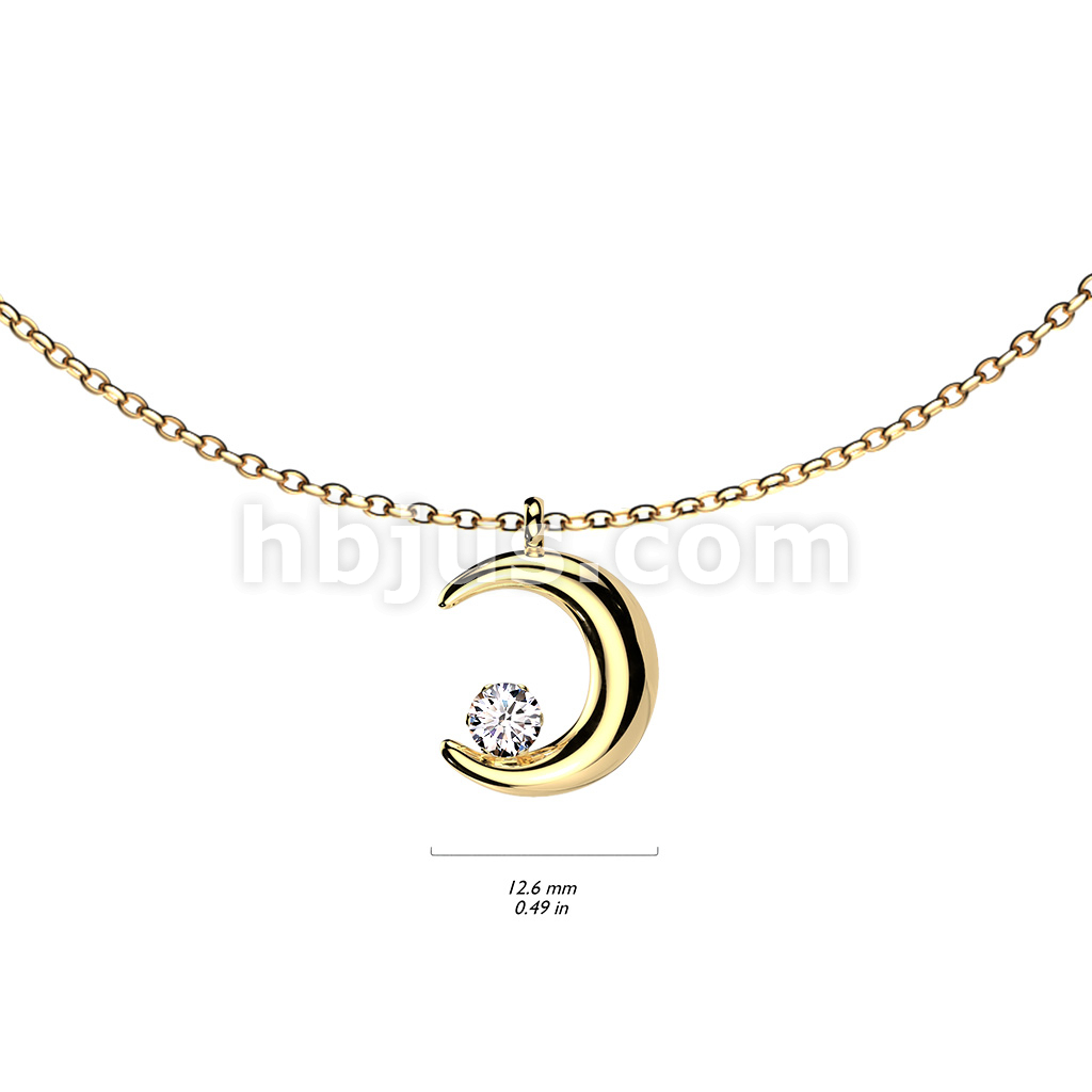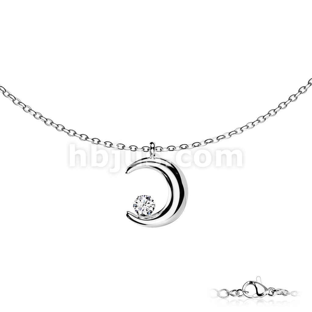Crescent Moon Pendant With Prong Set CZ Stainless Steel Chain Necklace