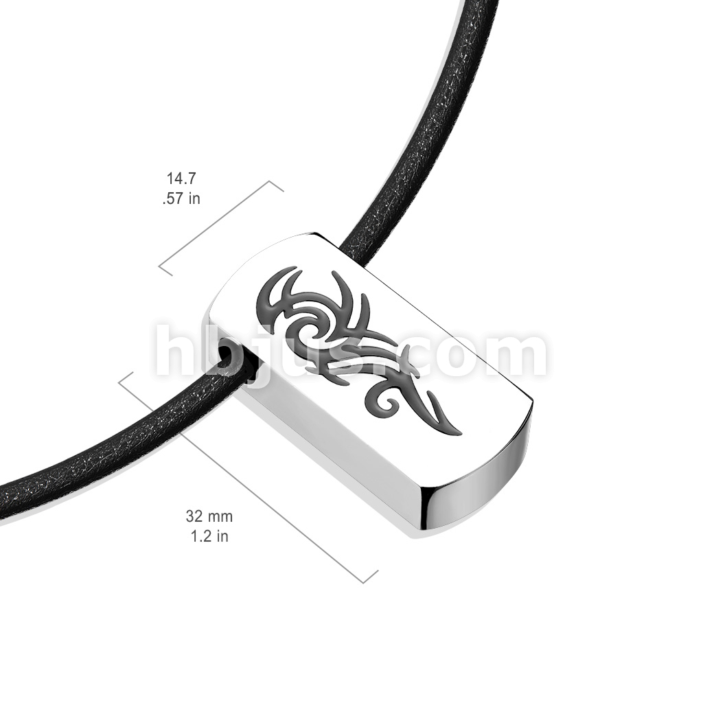 Tribal Orb Beveled Black IP 316L Stainless Steel Tag Pendant With Black Leatherette Necklace