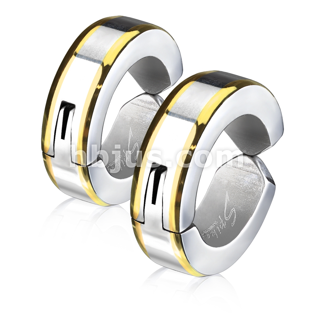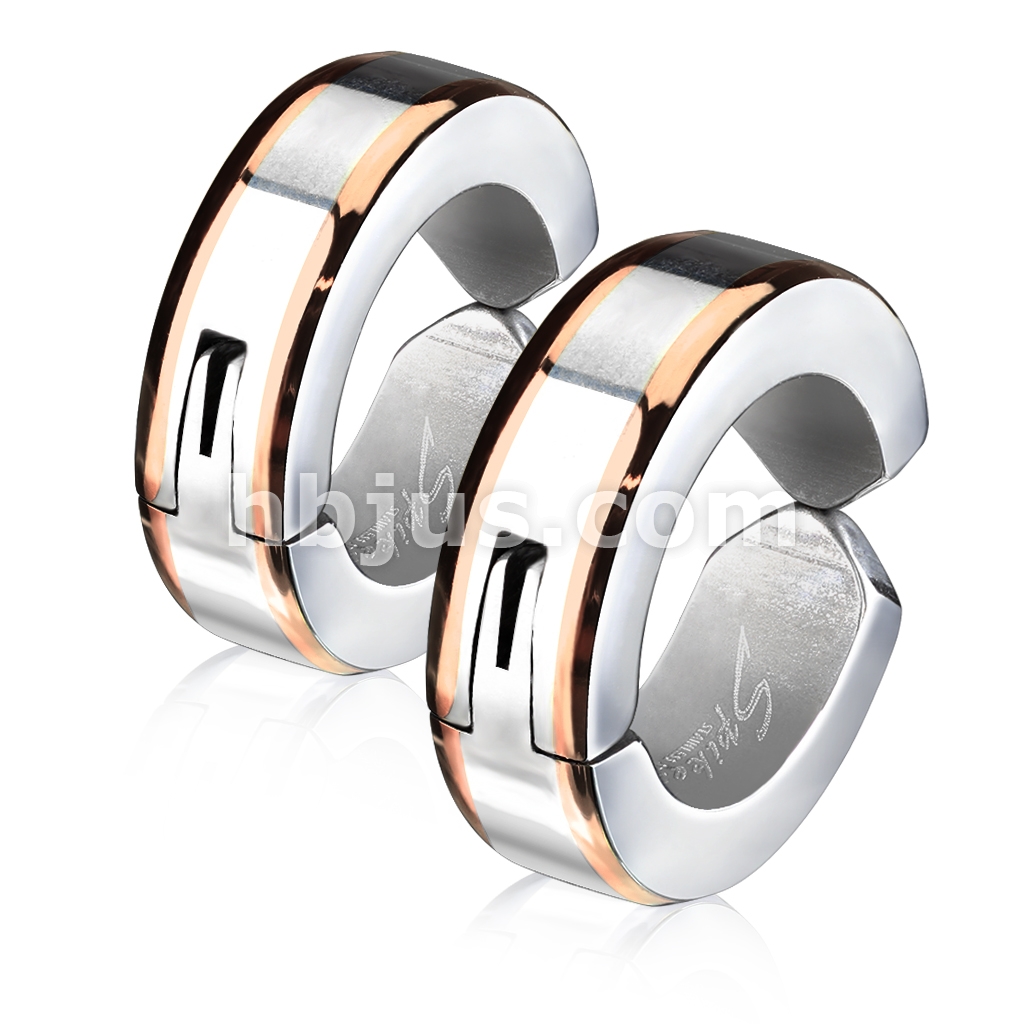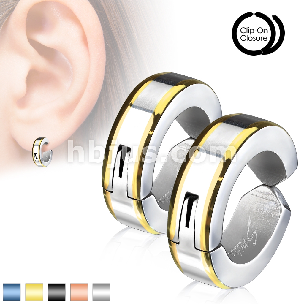Beveled Edge Strip Color IP Pair of 316L Surgical Stainless Steel Non-Piercing Clip On Round Earrings