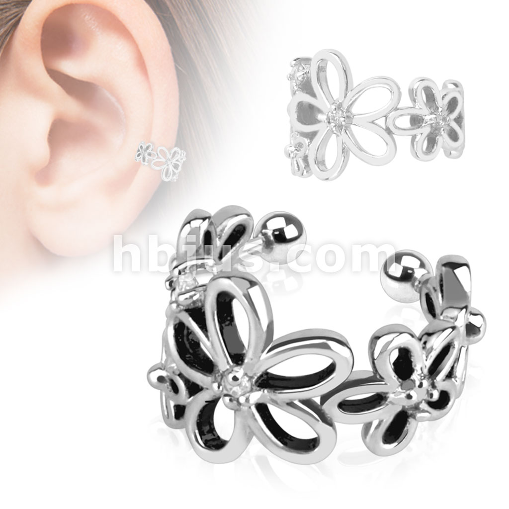 Flower with Clear CZ Rhodium Plated Brass Non-Piercing Ear Cuff