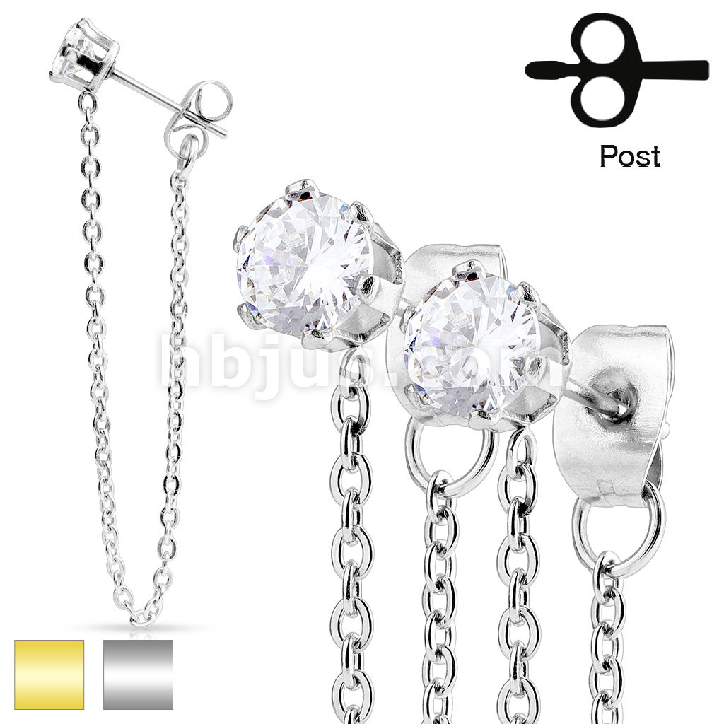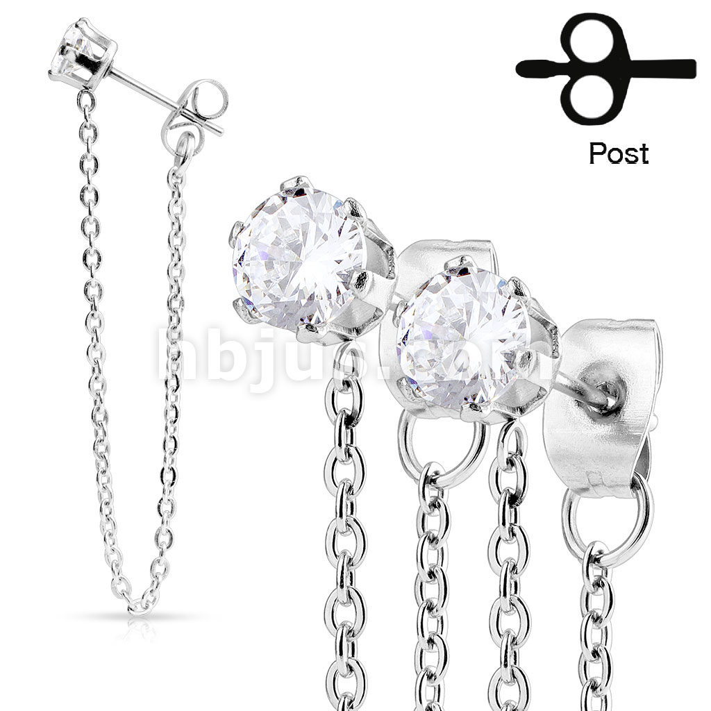 Pair of Chain Drops Prong Set CZ Stainless Steel Ear Stud Rings