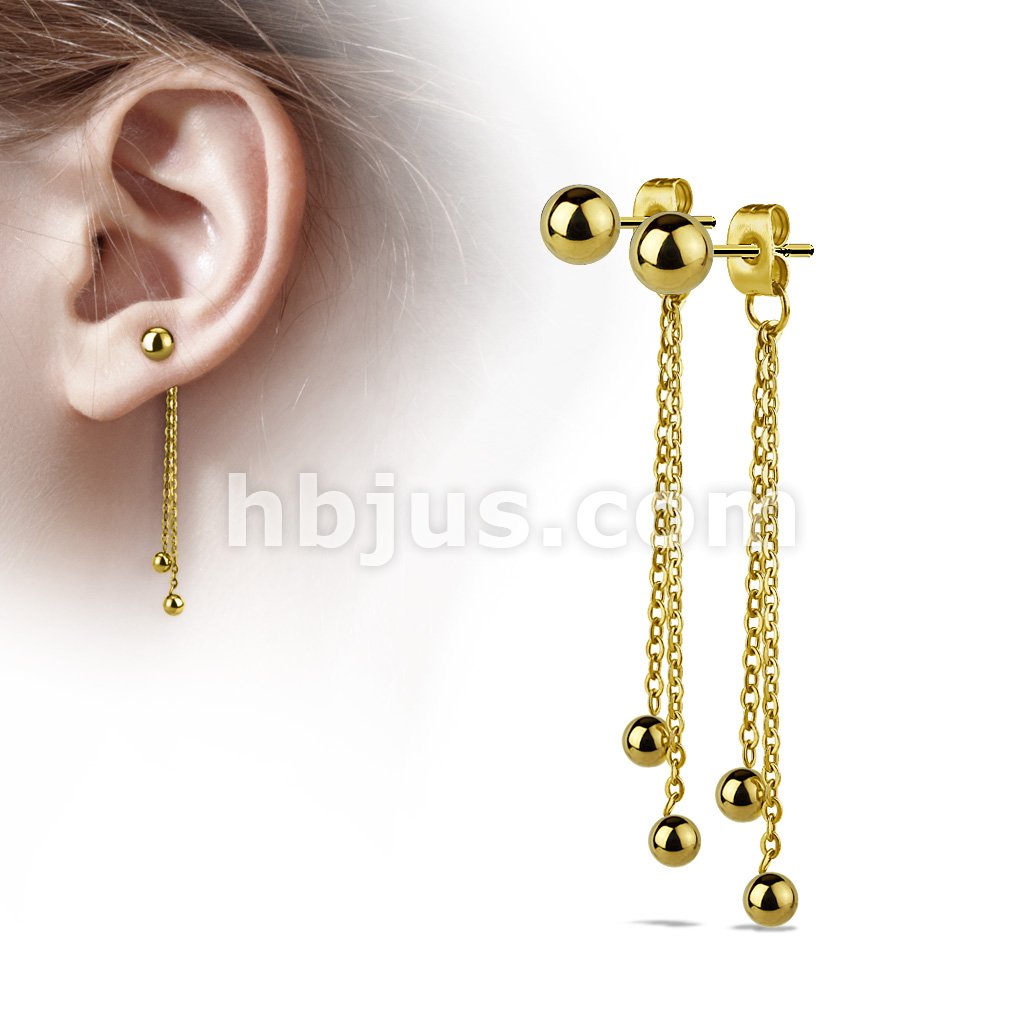 Pair of Two Chained Free Falling Steel Balls attached to Butterfly Clutch of a Stainless Steel Ball Earring Stud