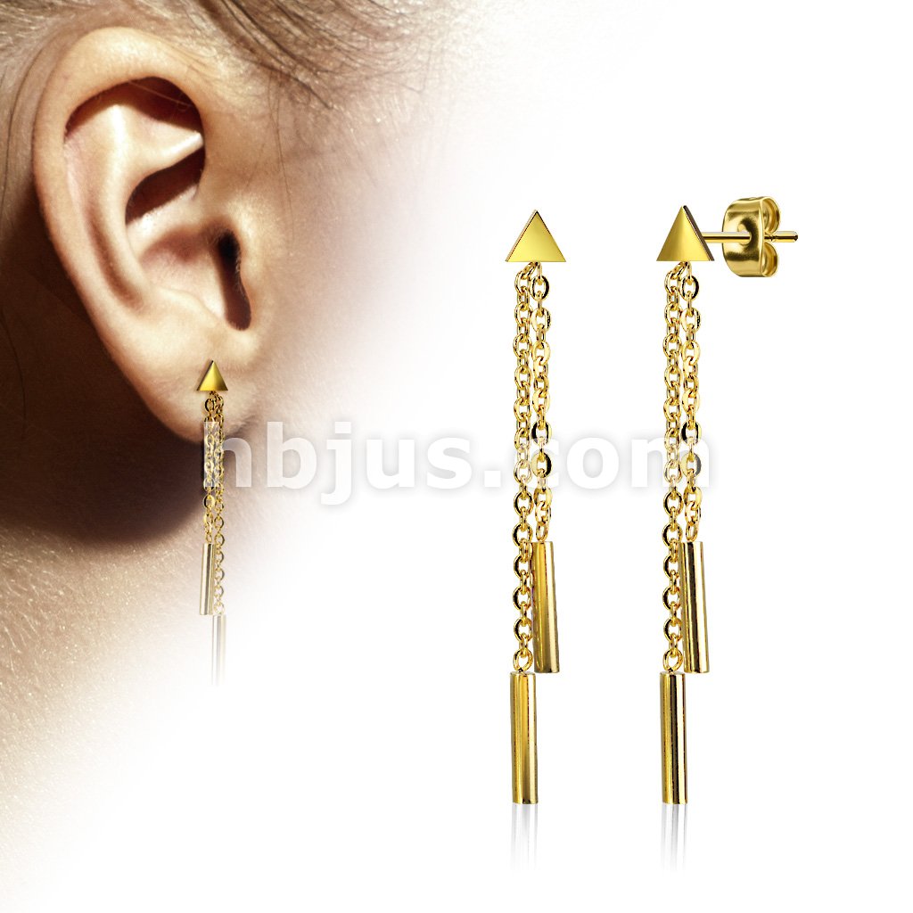 Pair of Hand Polished Triangle with 2 Chain Drop Round Bar Dangles 316L Stainless Steel Earring Studs