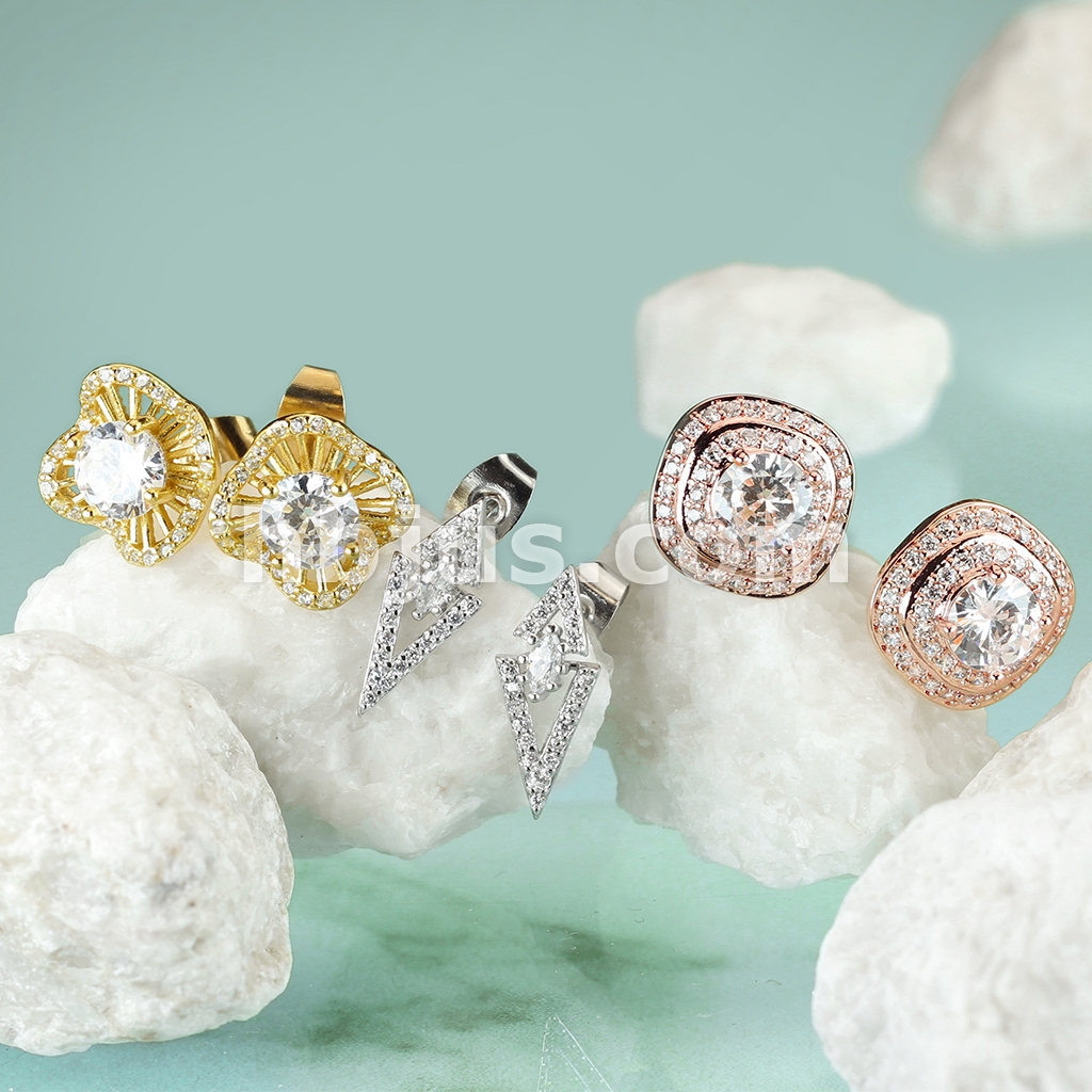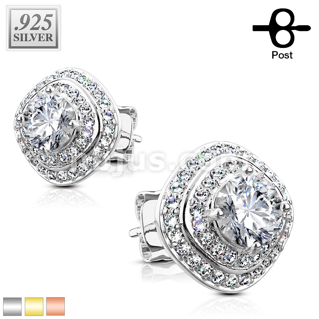 Pair of .925 Sterling Silver CZ Paved Triple Tier Square Stud Earrings