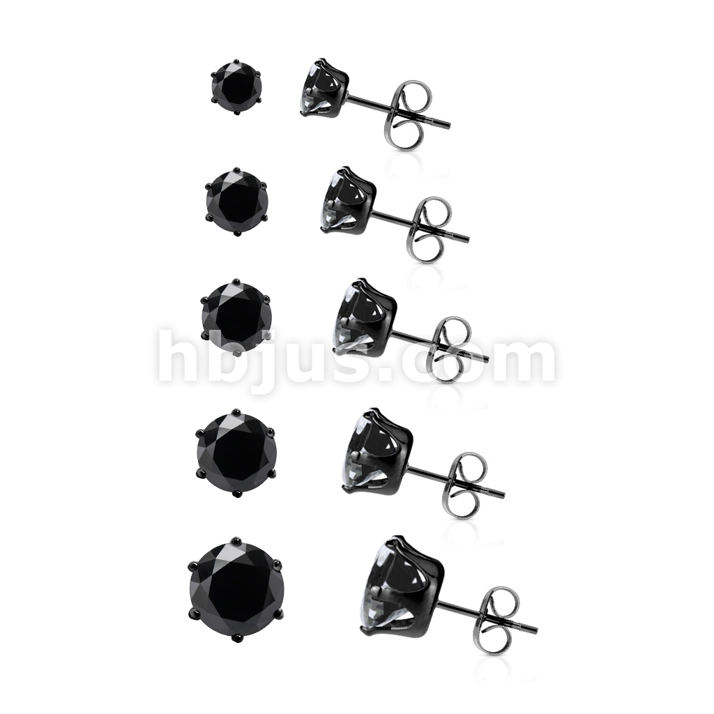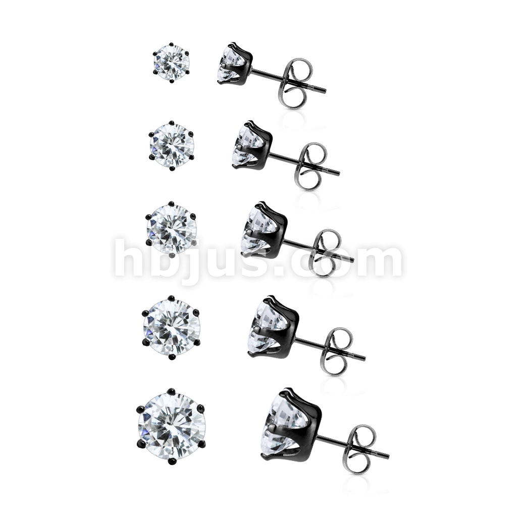 20 Pairs Of Assorted Size CZ Set Black IP Over 316L Surgical Steel Earring Studs Preloaded Into Puff Pad Acrylic Display Case (4 Pairs x 5 Sizes)