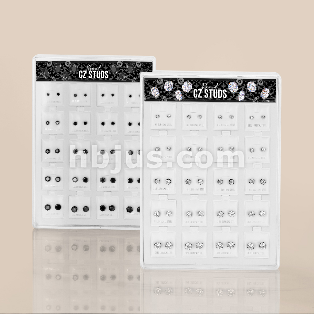 Includes 20 pairs of Assorted Size CZ Set 316L Surgical Steel Earring studs individually set into puff pads and encased by counter top acrylic display.