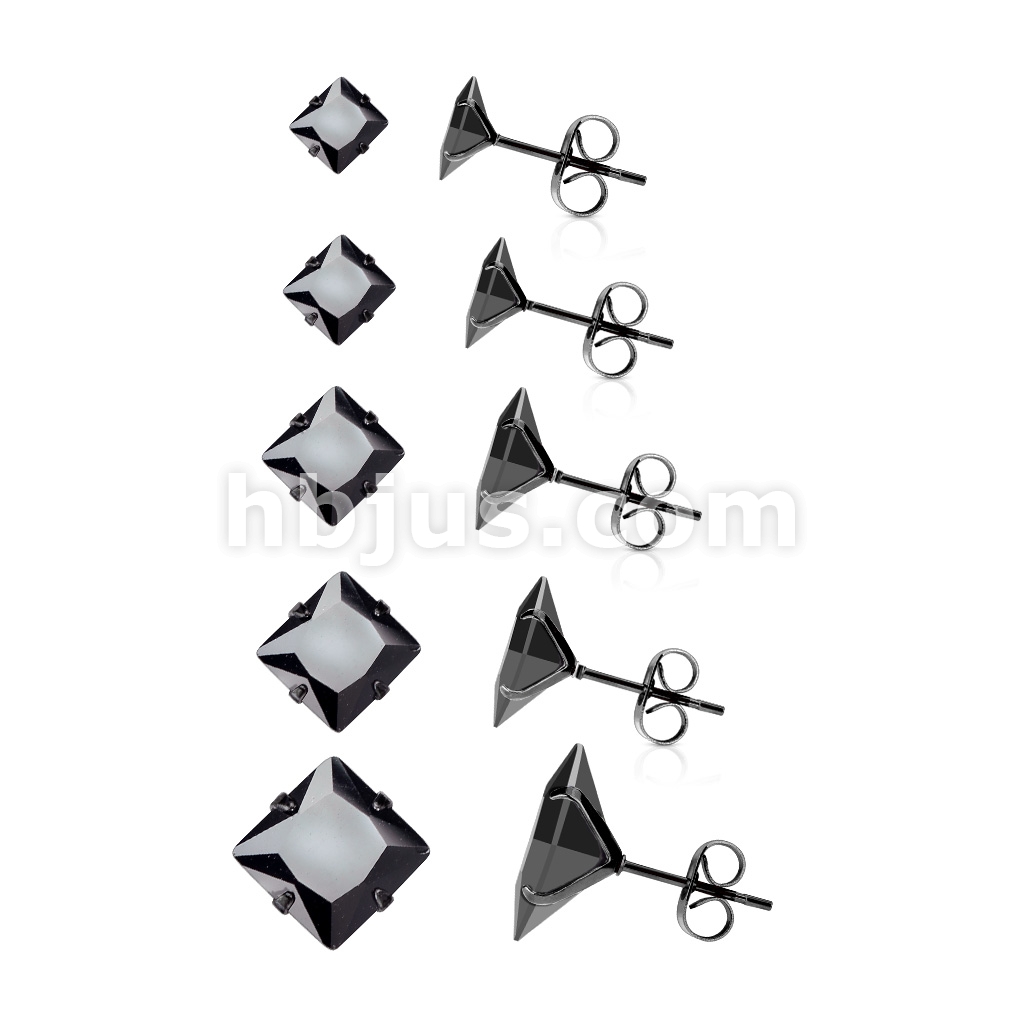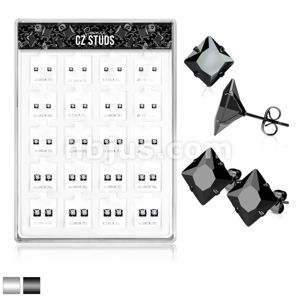 20 Pairs Of Assorted Size Square CZ Set Black IP 316L Surgical Steel Earring Studs Preloaded Into Puff Pad Acrylic Display Case (4 Pairs x 5 Sizes)