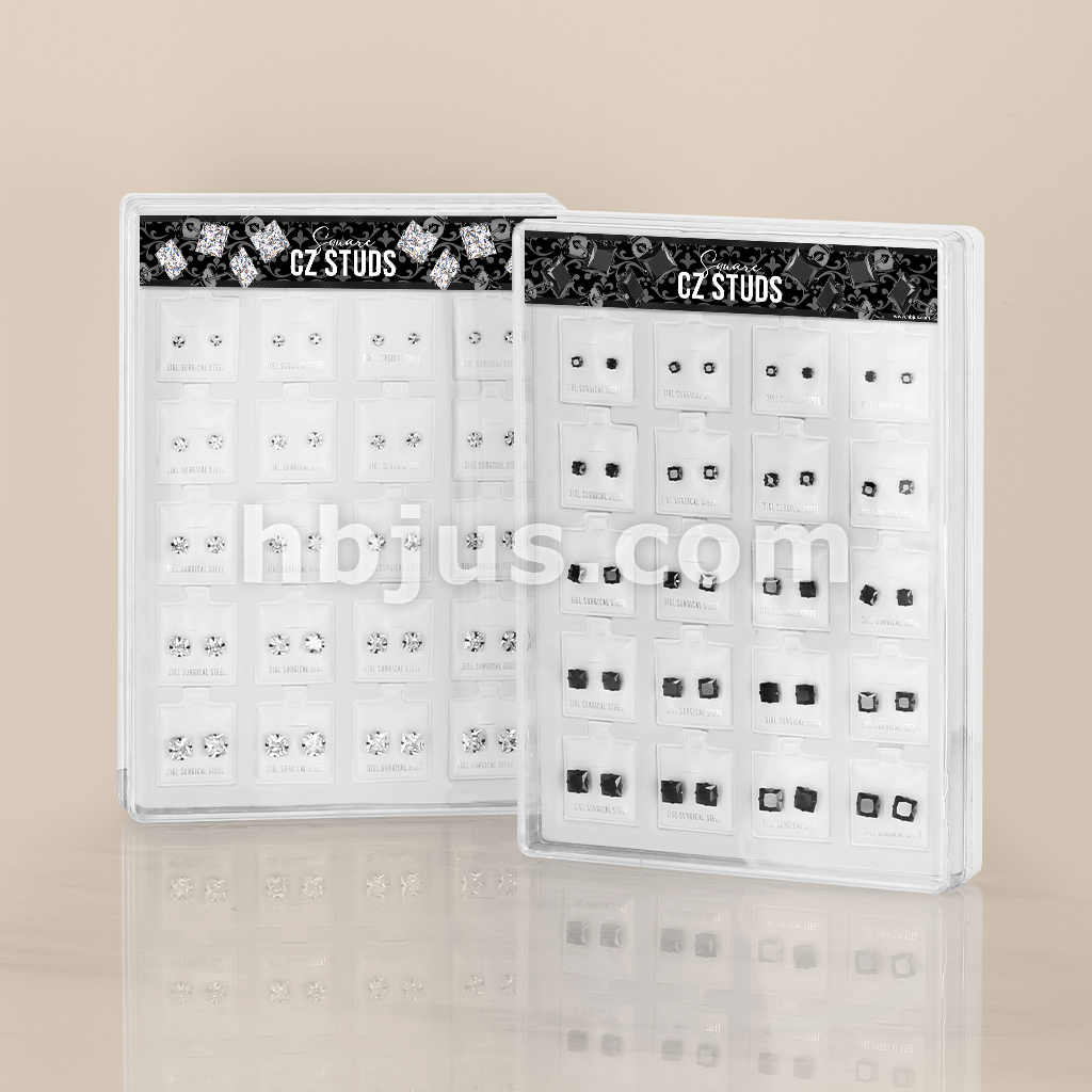 Includes 20 pairs of Assorted Size CZ Set 316L Surgical Steel Earring studs individually set into puff pads and encased by counter top acrylic display.
