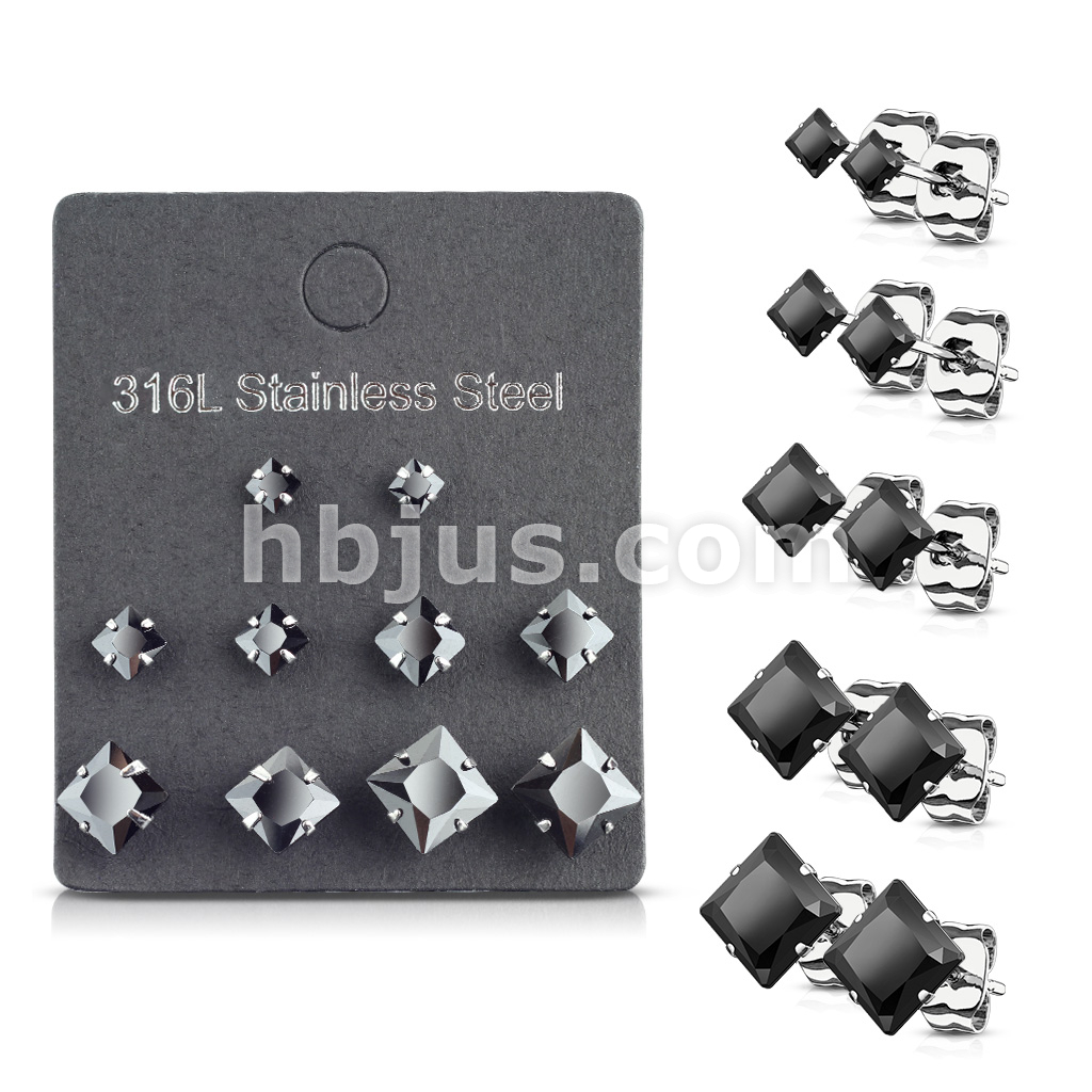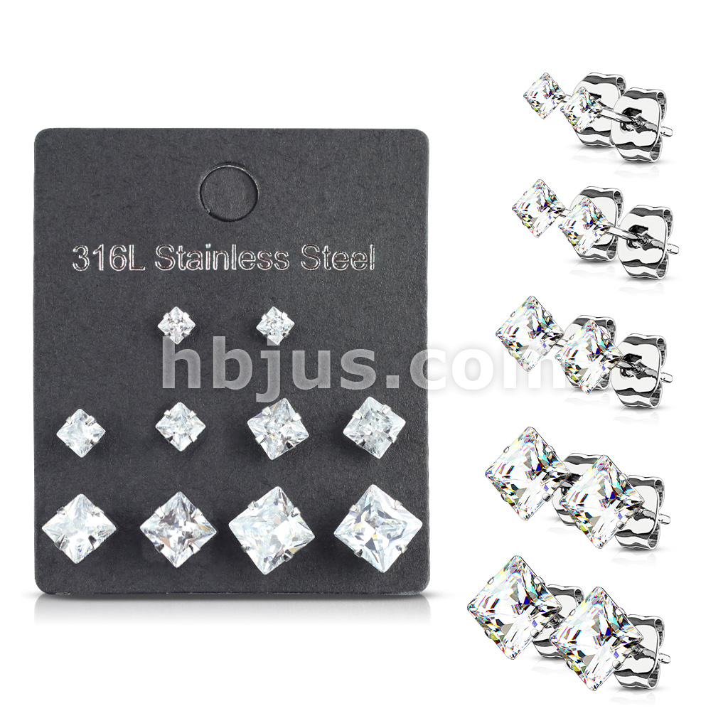 5 Pairs of Assorted Sizes Prong Set Square CZ Stainless Steel Stud Earrings Pack