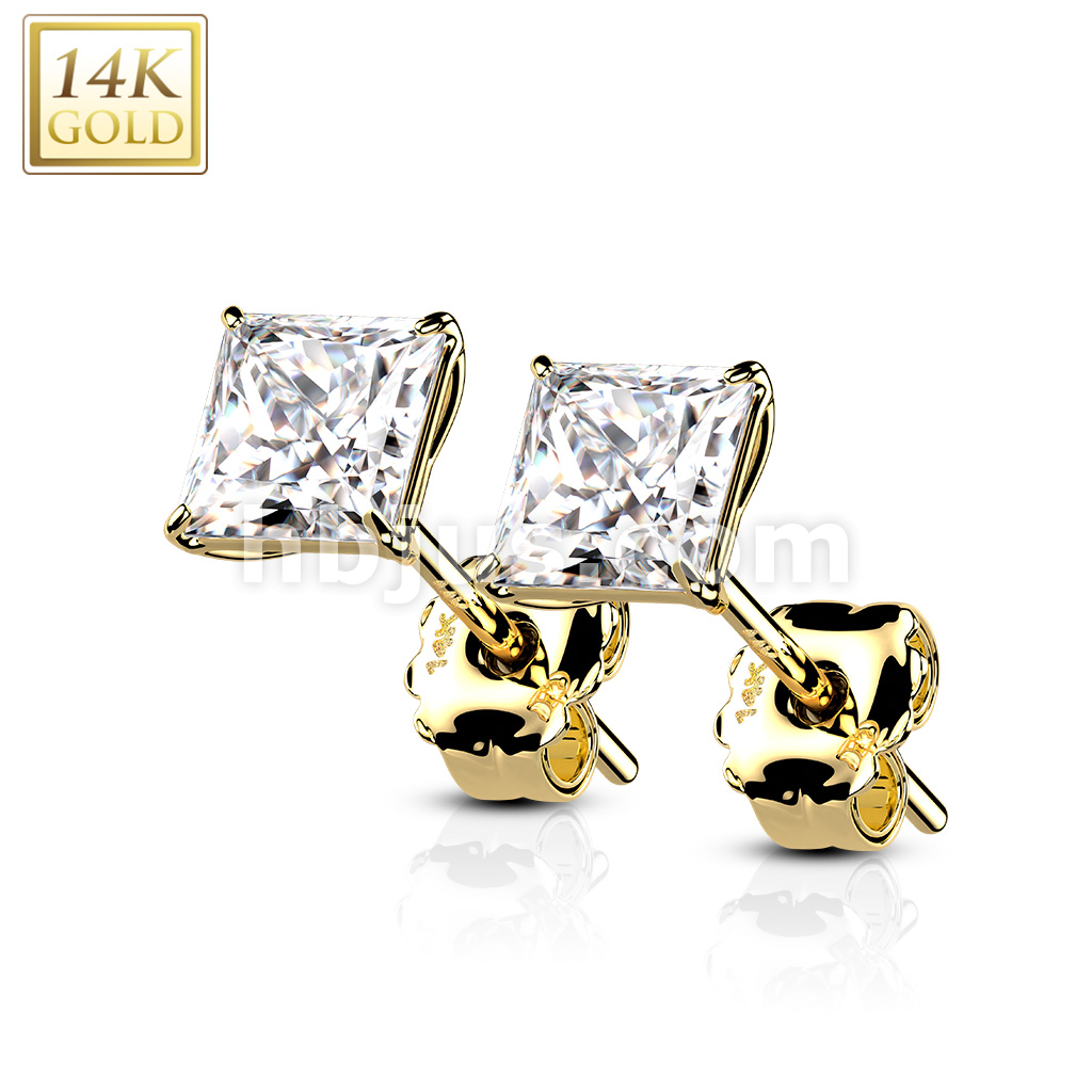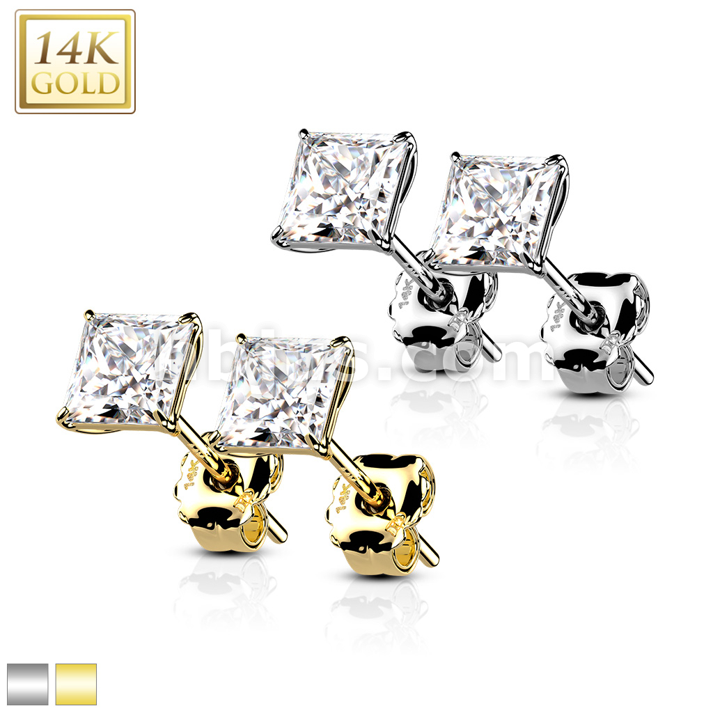 Pair of 14K Gold Ear Studs with Square Prong Set CZ