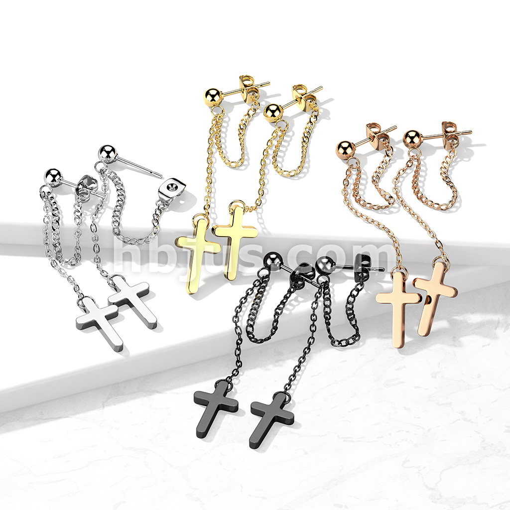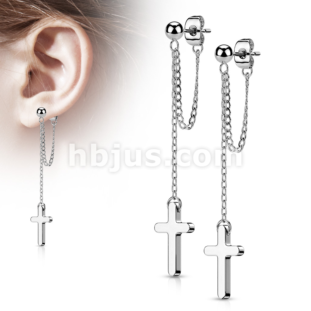 Pair of 316L Surgical Steel Ball Stud Earrings with Chain Link and Cross Dangling
