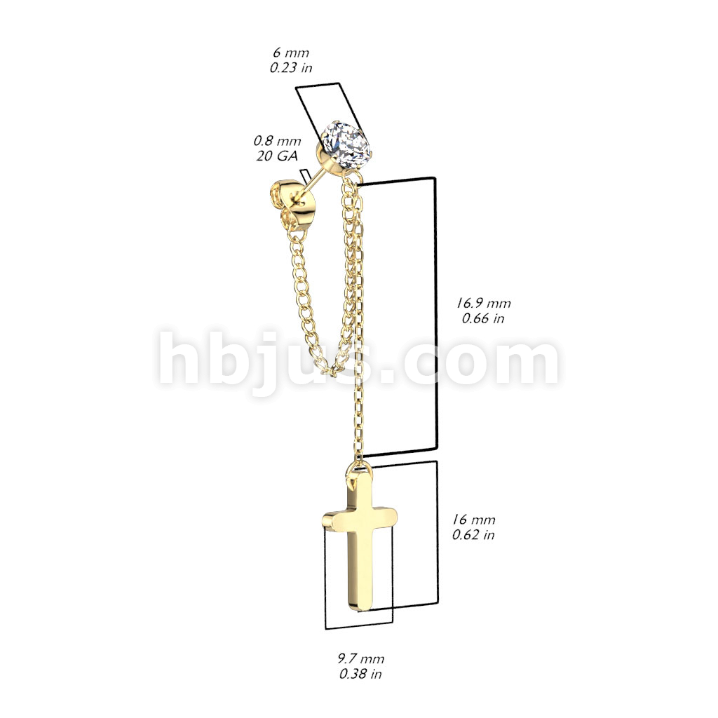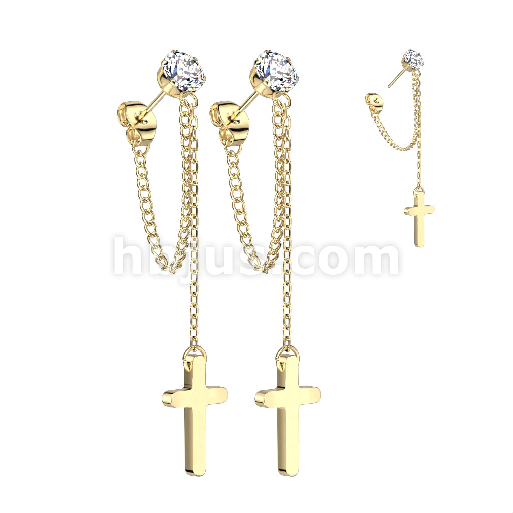 Pair of 316L Surgical Steel CZ Stud Earrings With Chain Link and Cross Dangling