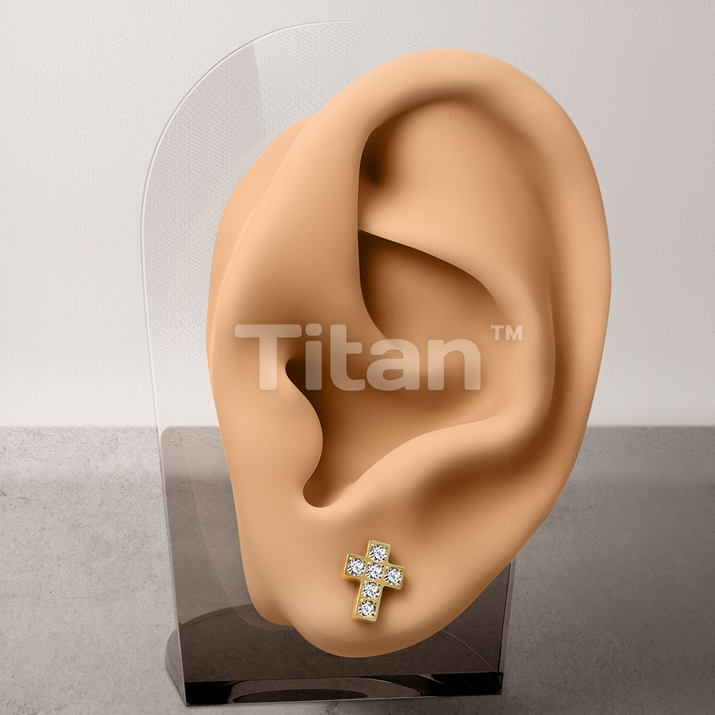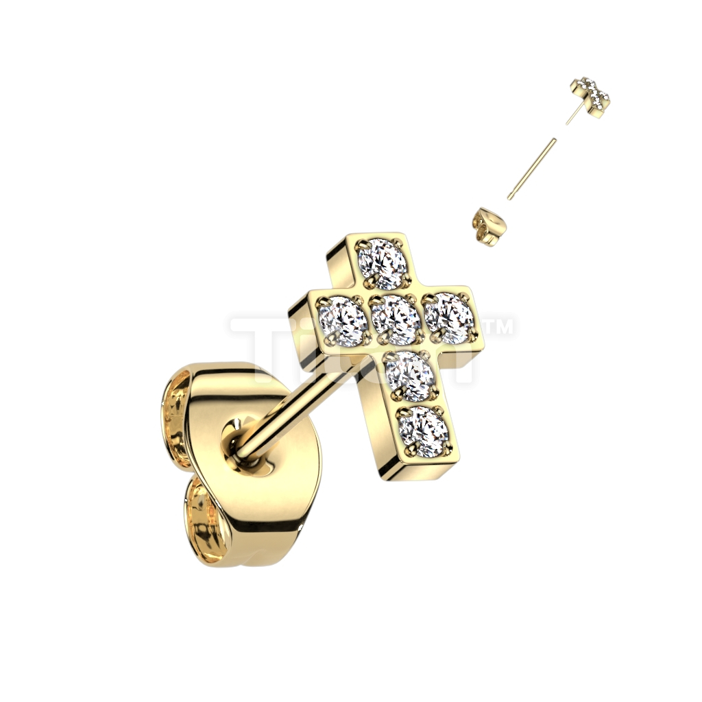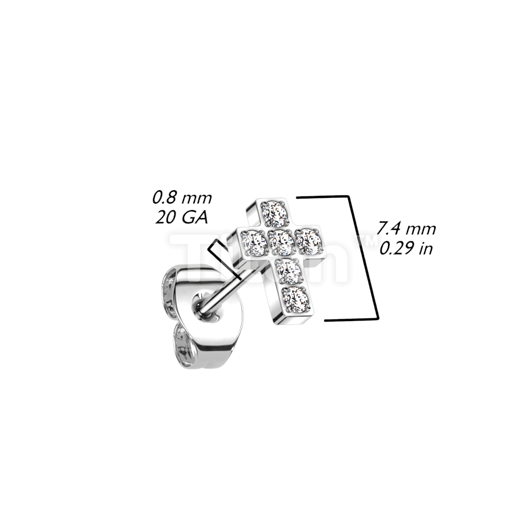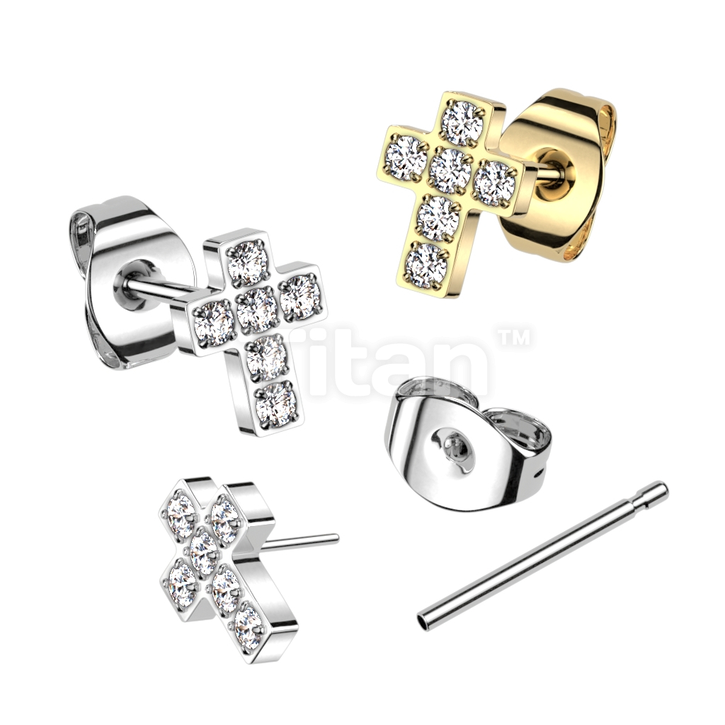 1pc Implant Grade Titanium Threadless Push in Earring Stud With 6 CNC Set CZ Cross Top