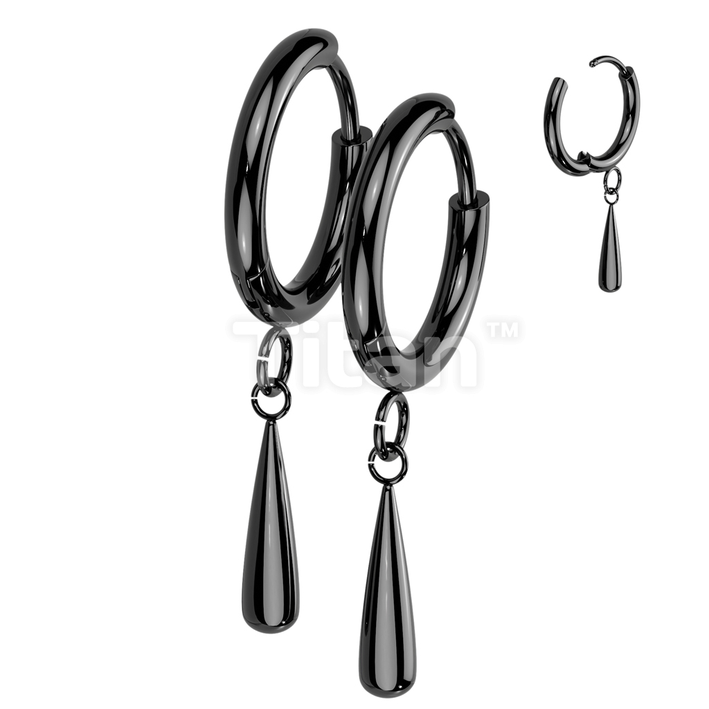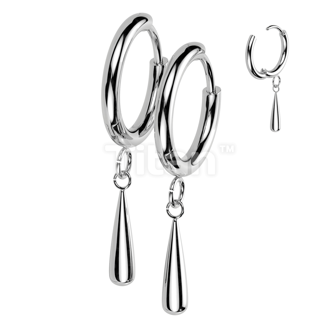 Pair of Implant Grade Titanium 2mm Thick Hinged Plain Round Hoop Earrings With Teardrop Dangle