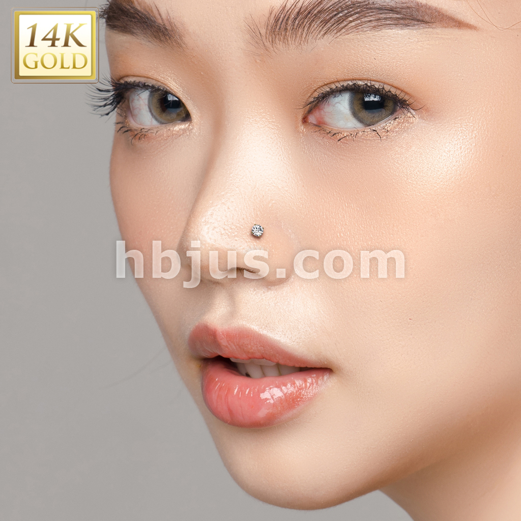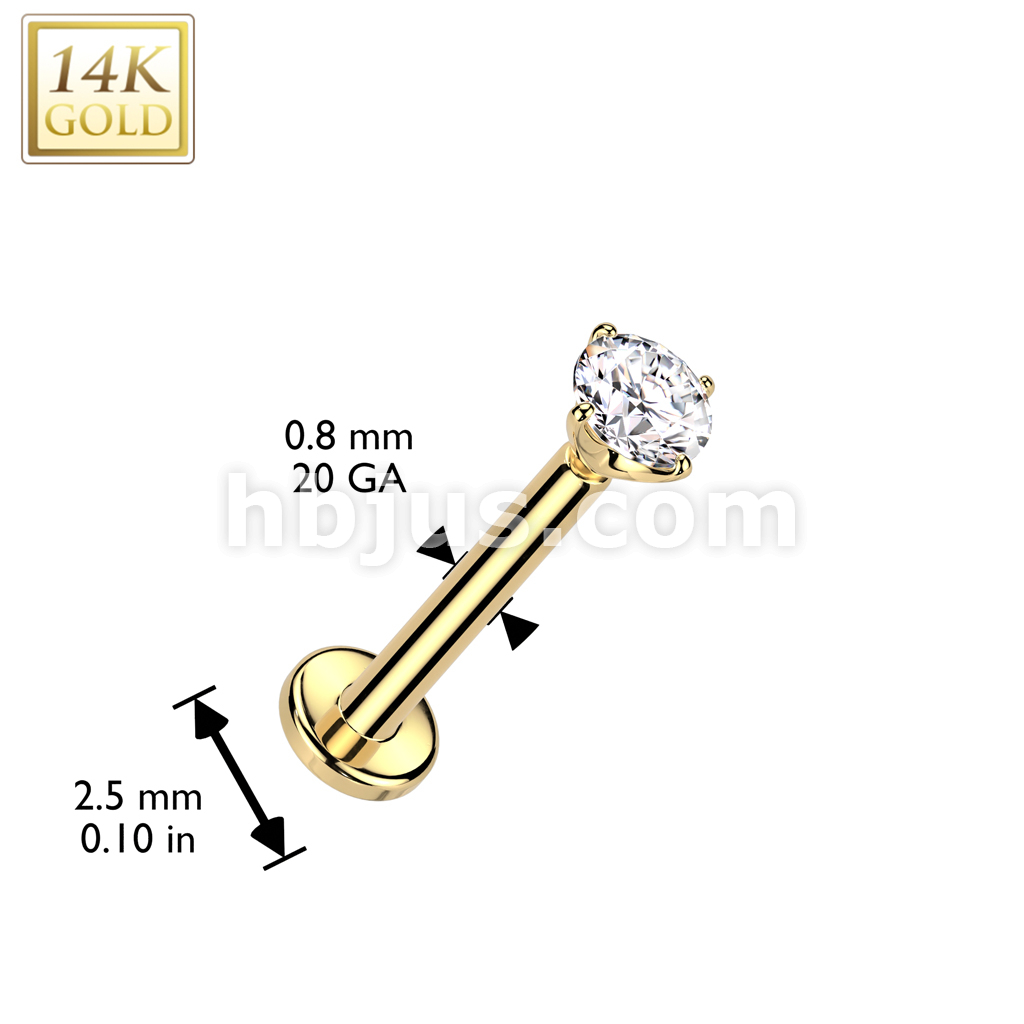 14K Gold Threadless Push In 20ga Flat Back Stud With Prong Set CZ Top For Nose, Ear and More