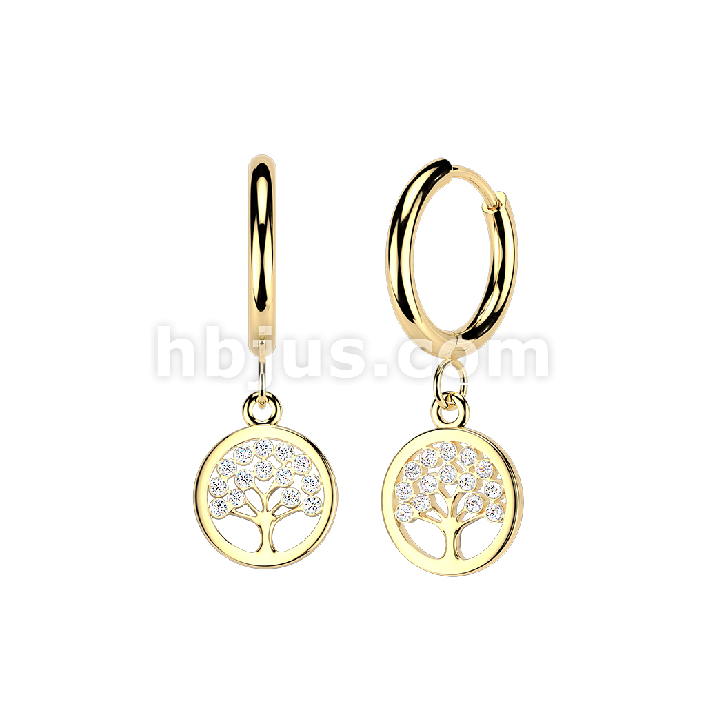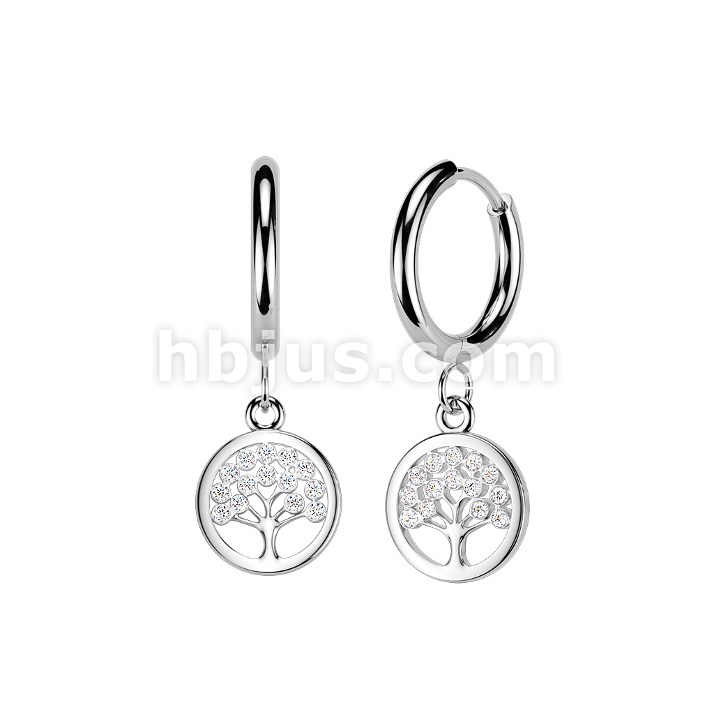 Pair of 316L Stainless Steel Hinged Hoop Earrings With CZ Tree of Life Dangle