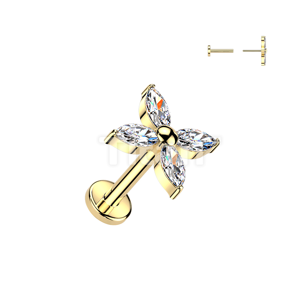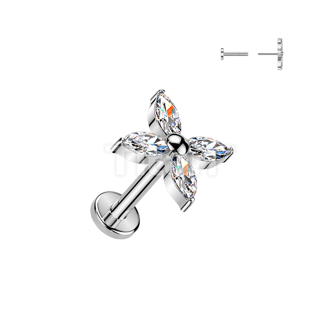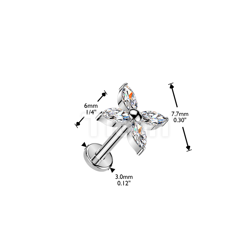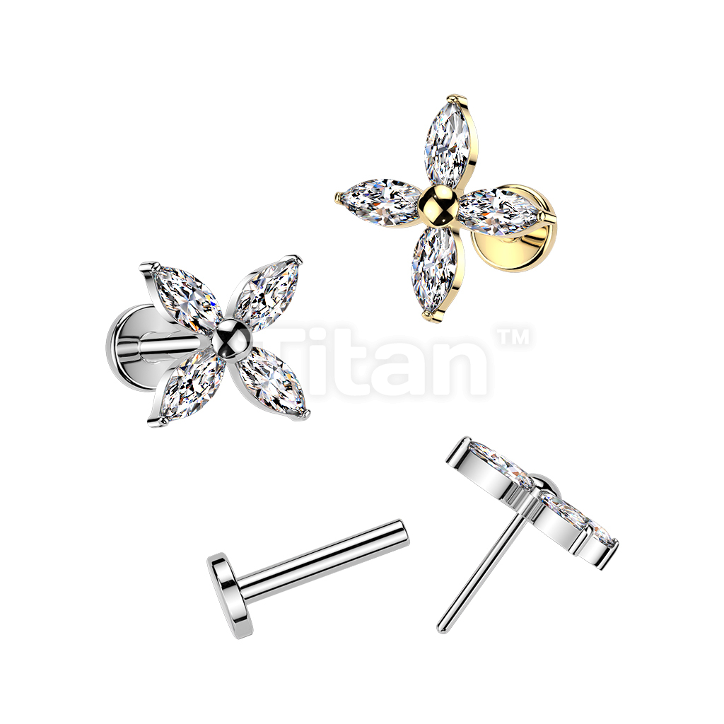 Titanium Threadless Push In Flat Back Earring Stud With Marquise CZ Flower Top