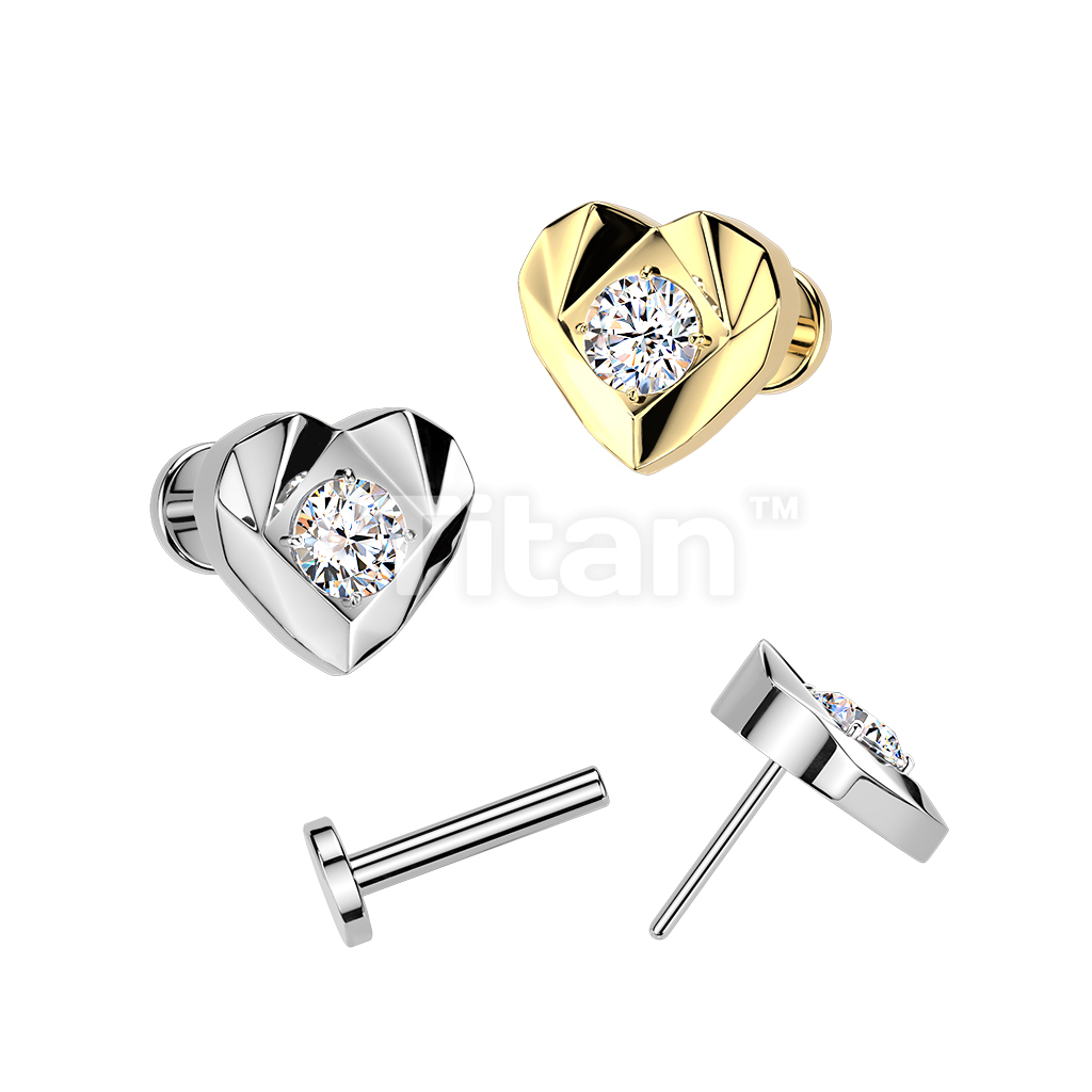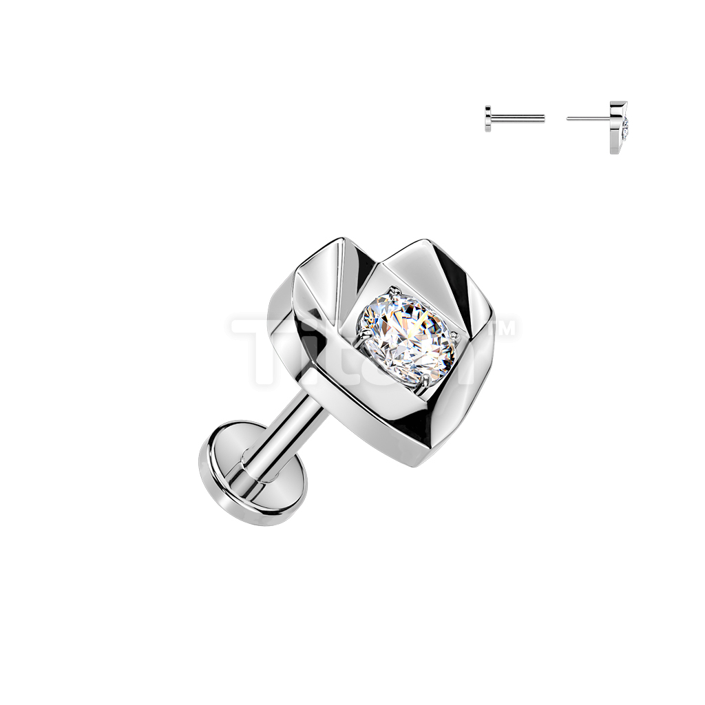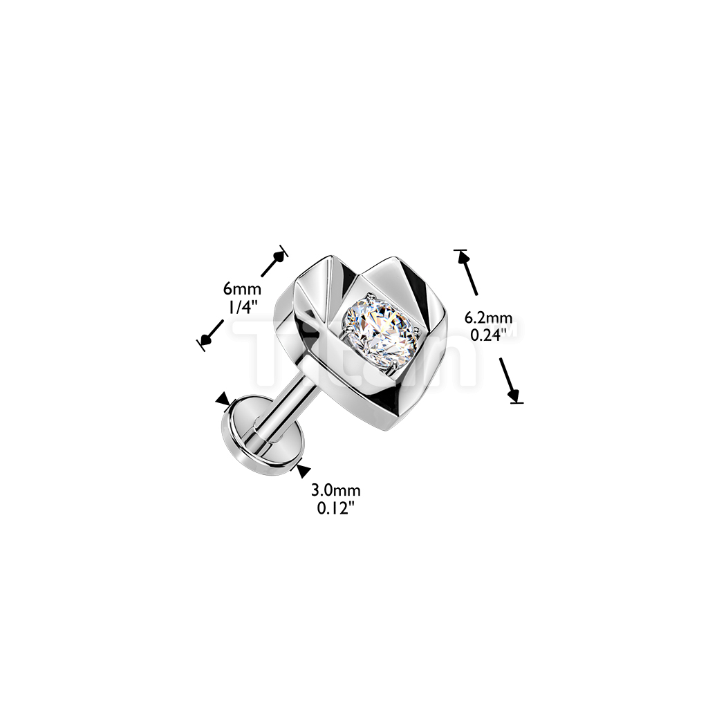 Titanium Threadless Push In Flat Back Earring Stud With Faceted Heart And CZ Center Top
