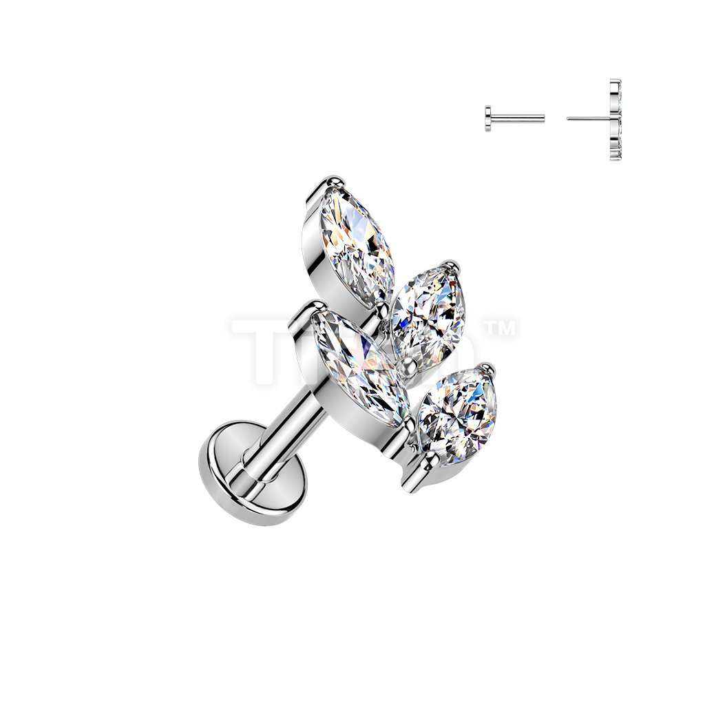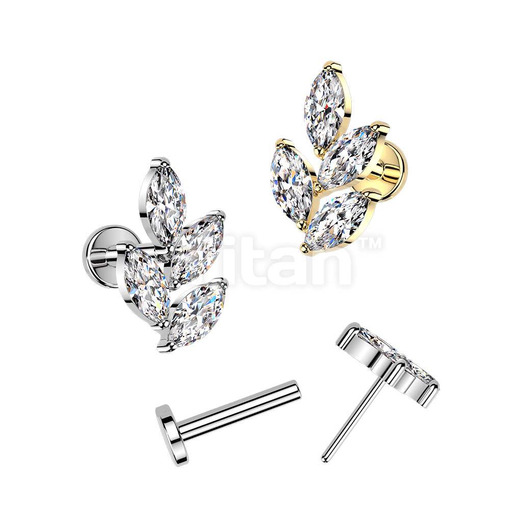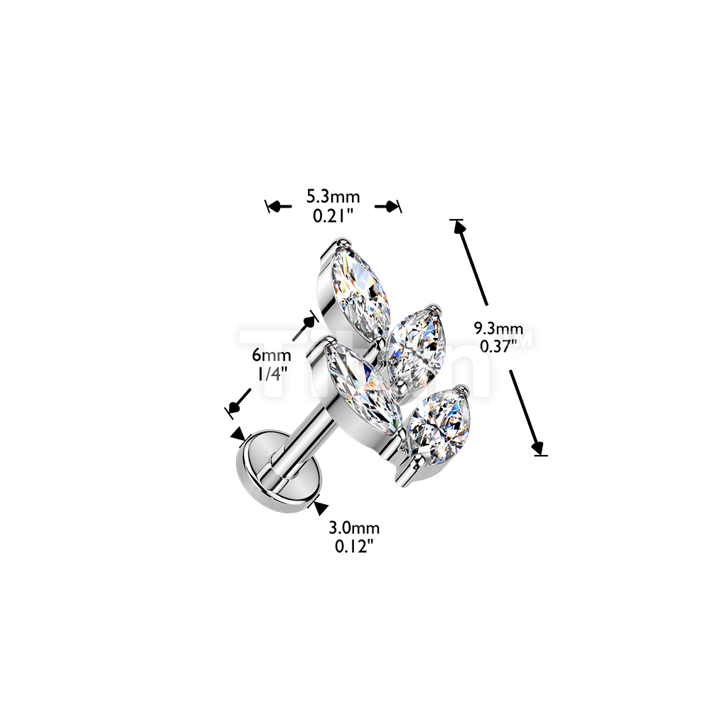 Titanium Threadless Push In Flat Back Earring Stud With Marquise CZ Leaf Top