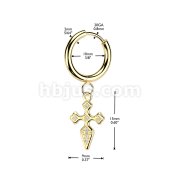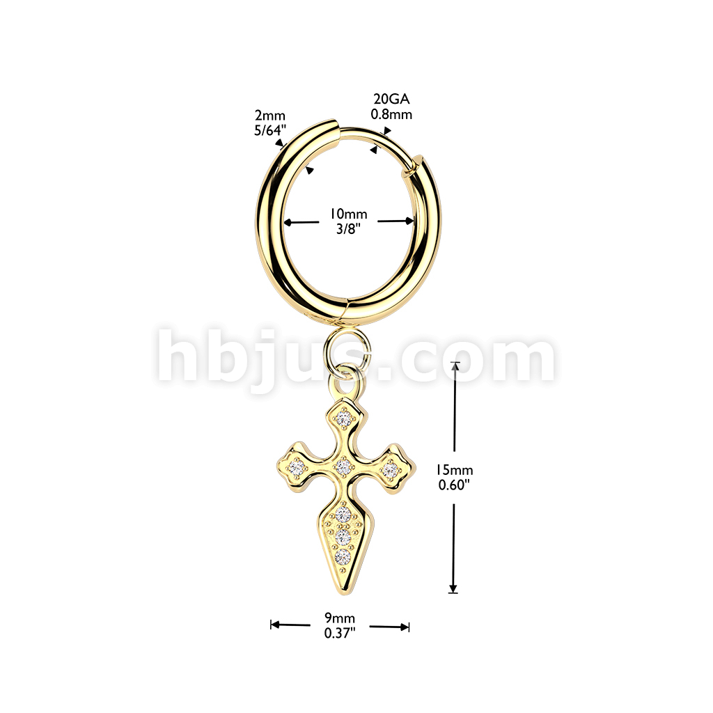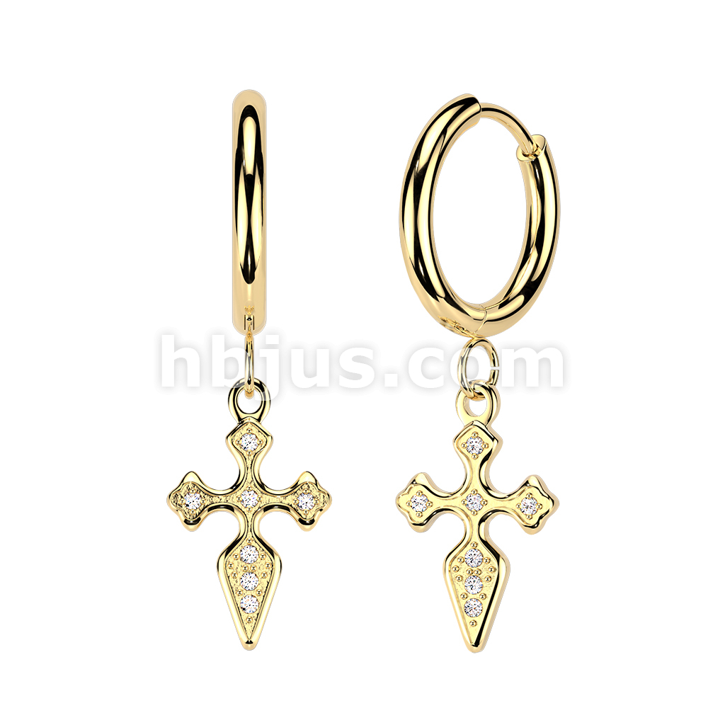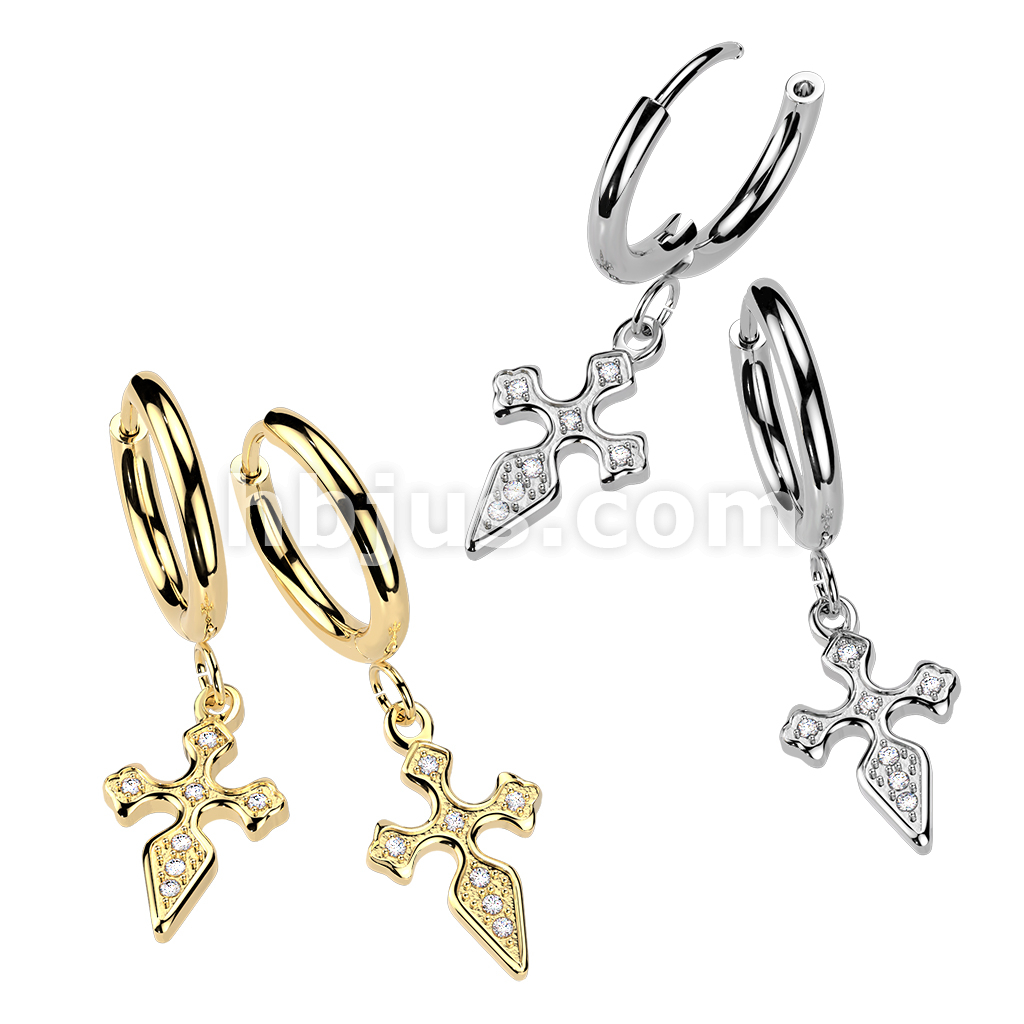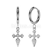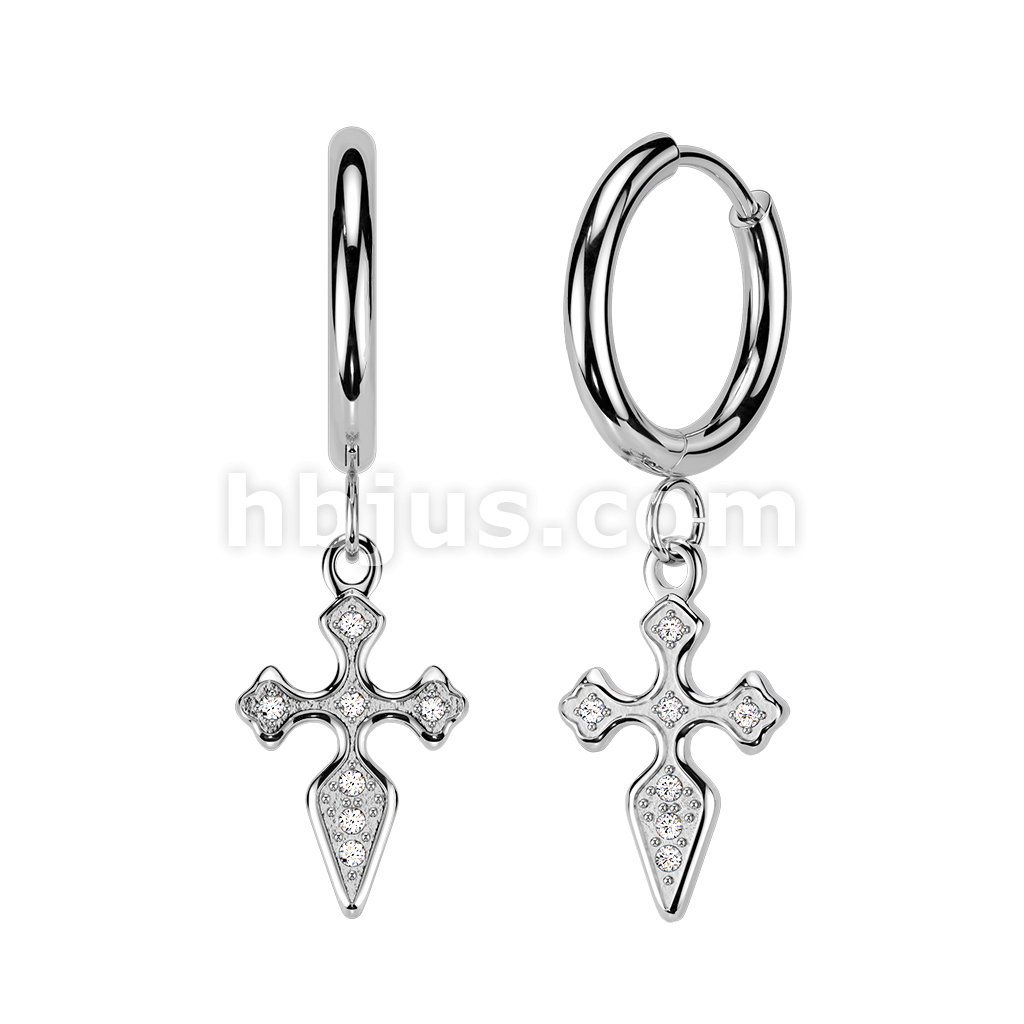 316L Pair of Hinged Hoop Earrings With Pave CZ Cross Dangle