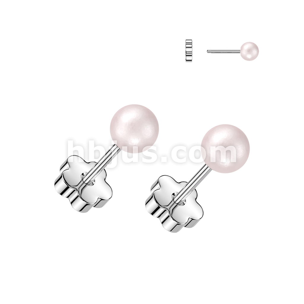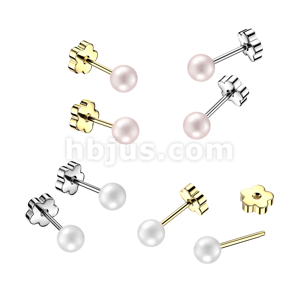 Pair of 316L Surgical Steel Pearl Earring Studs With Flower Screw Back