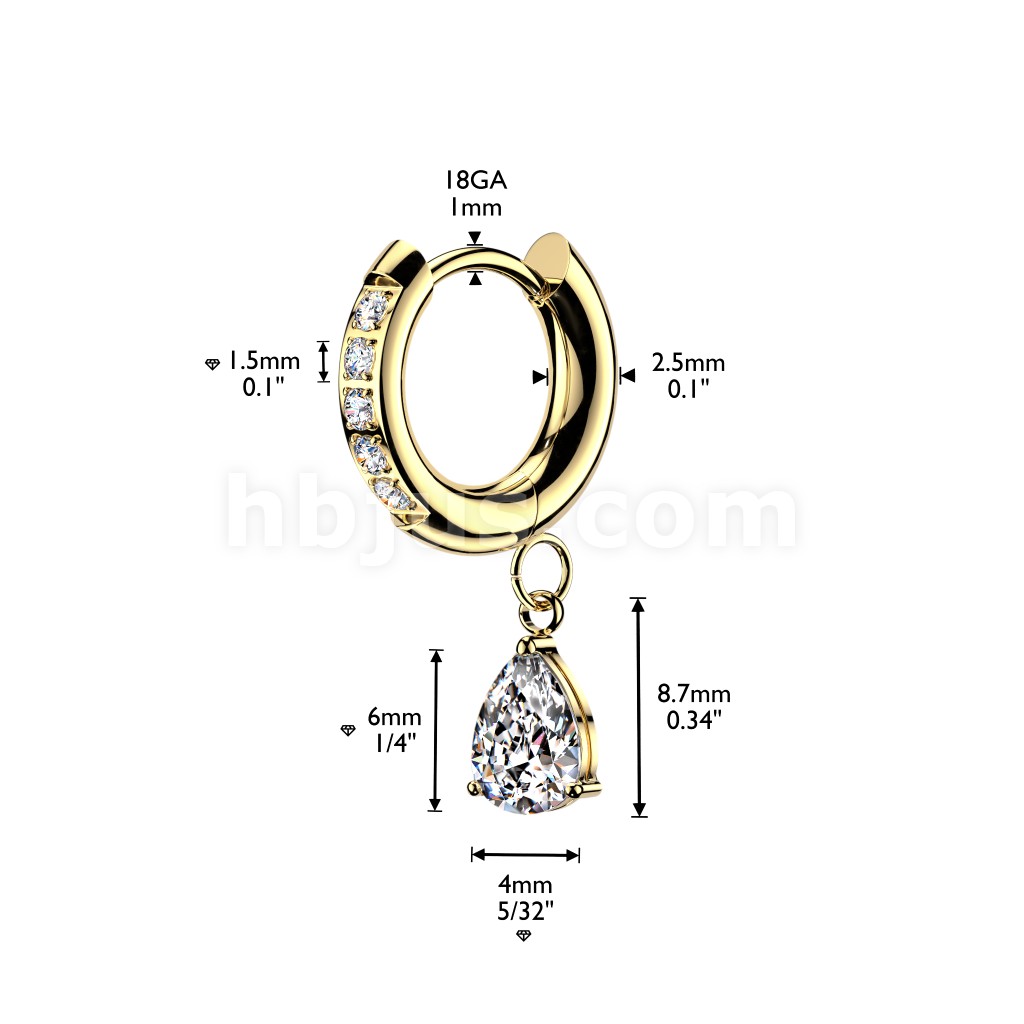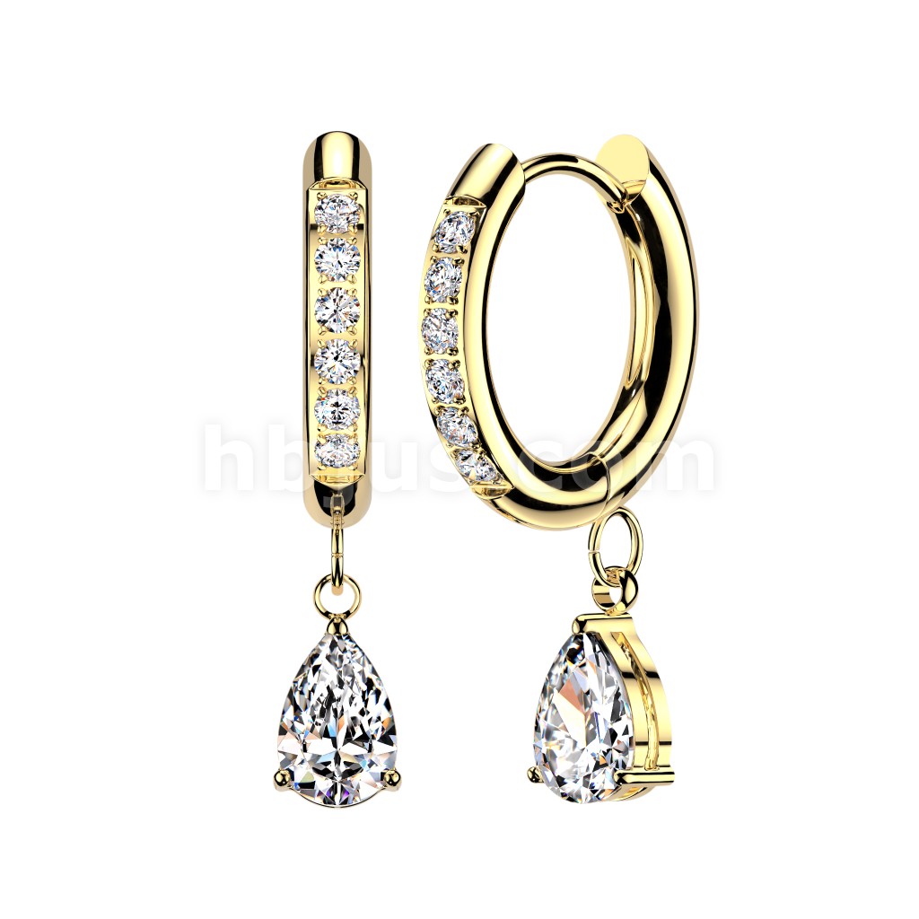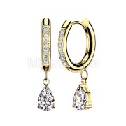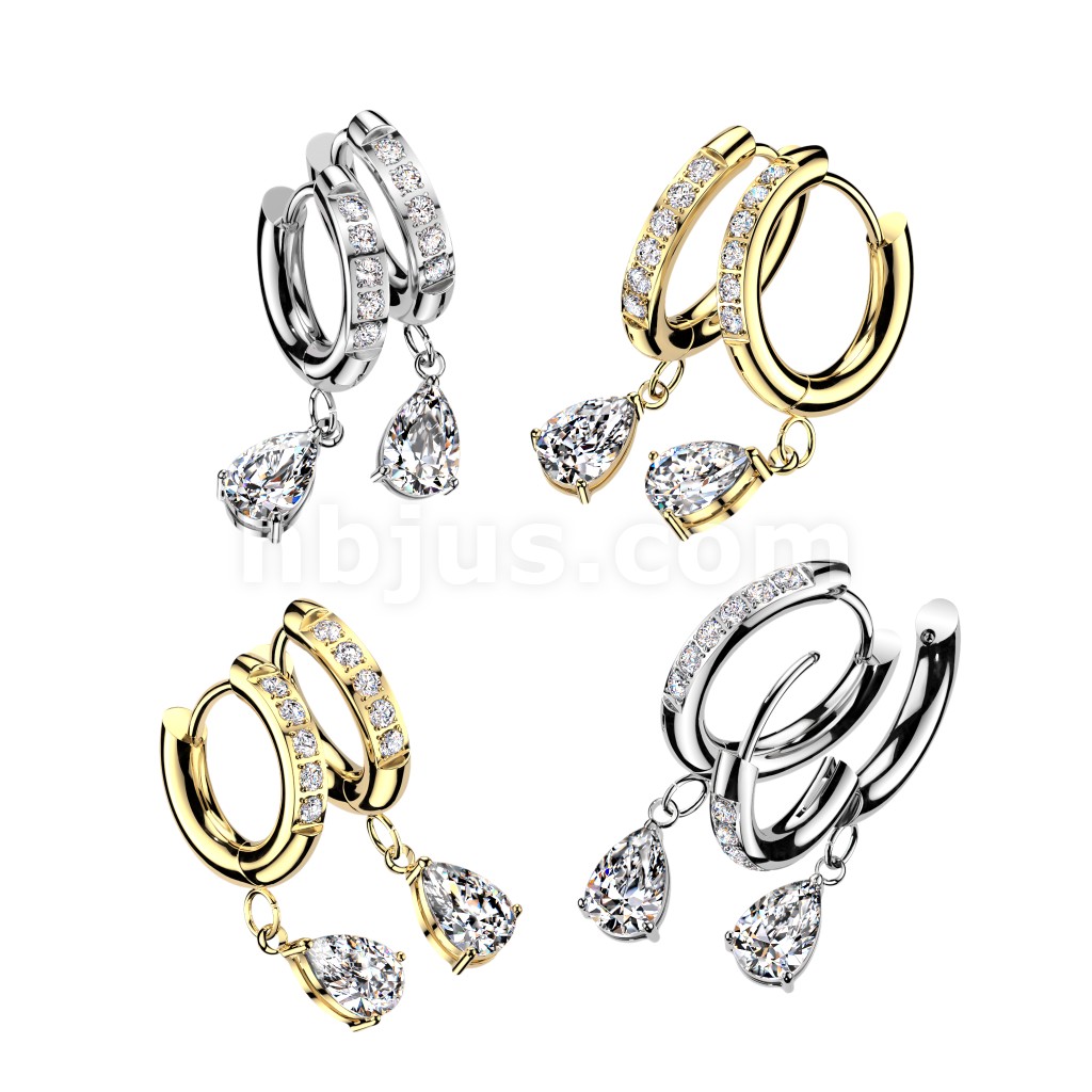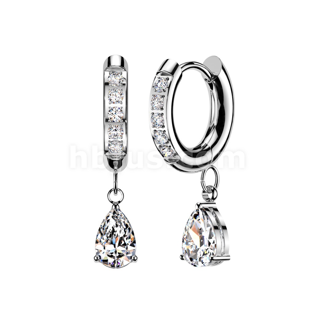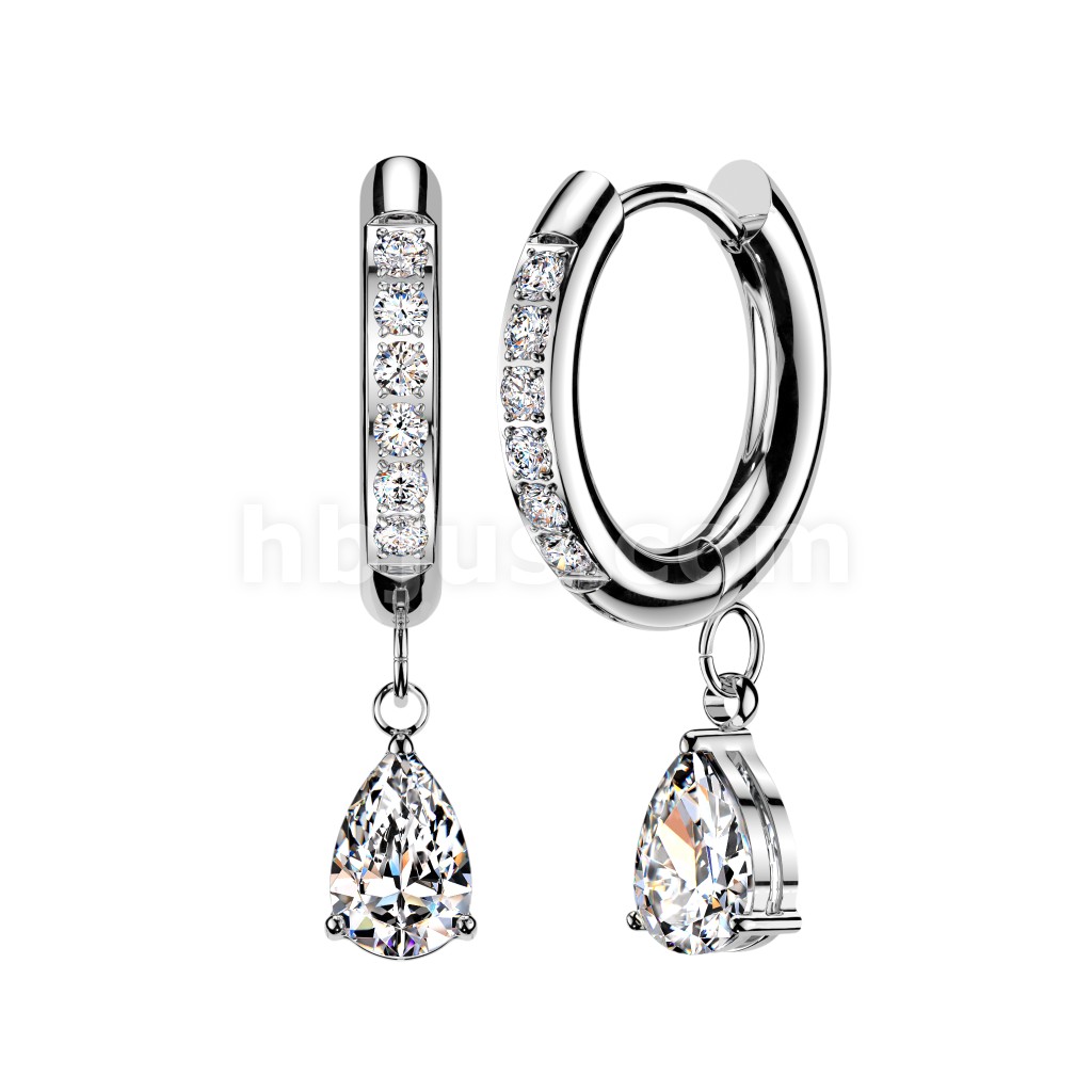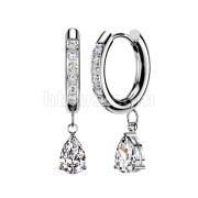316L Surgical Steel Pair of CNC Set CZ Hoop Earrings With Teardrop CZ Dangle