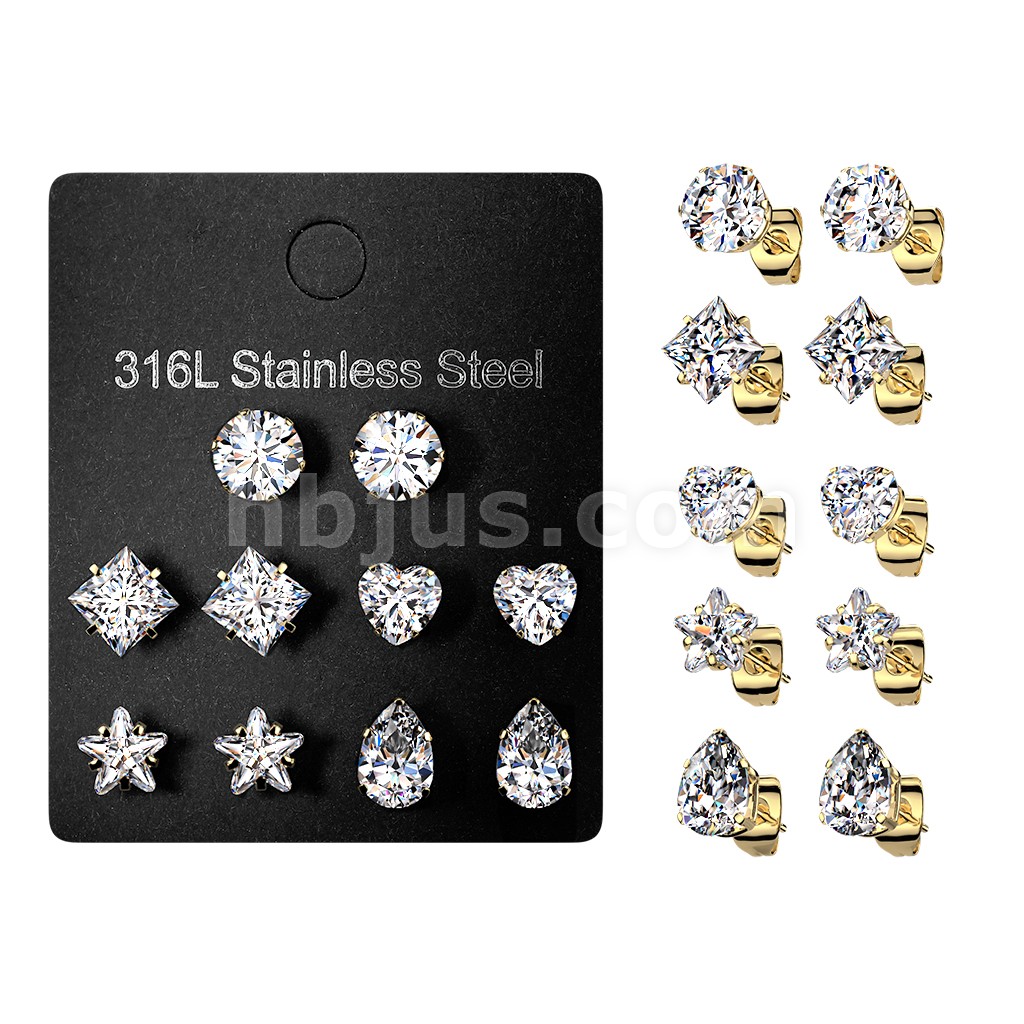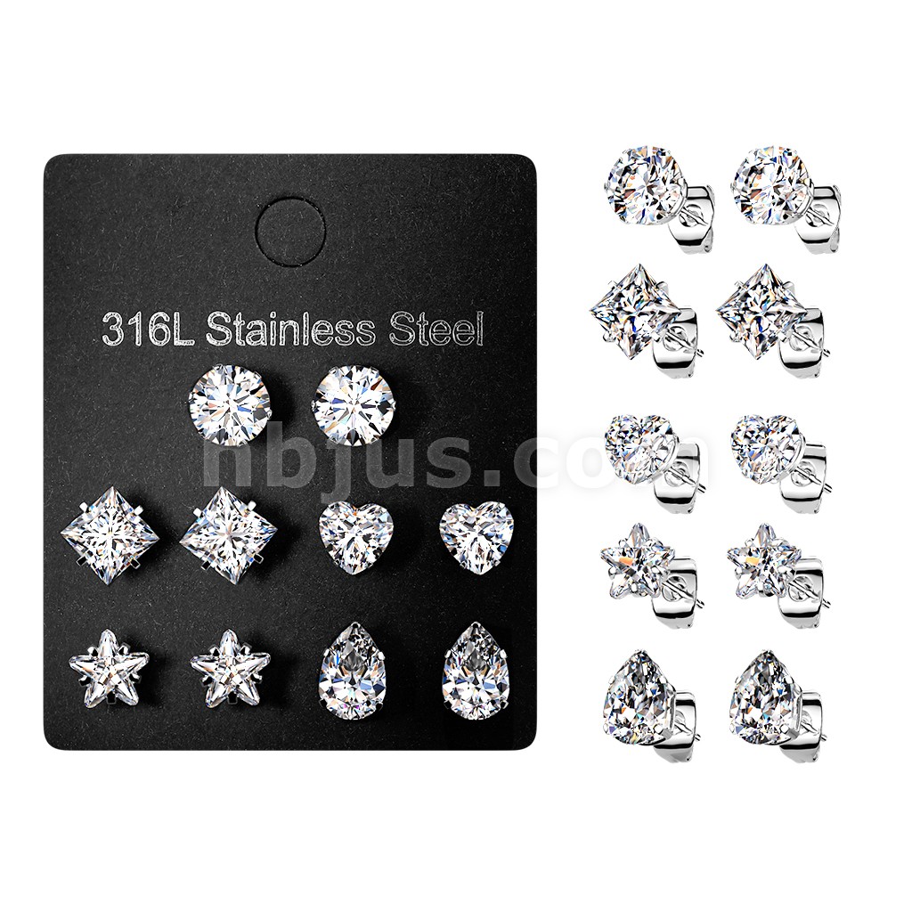 5 Pairs of 316L Surgical Steel Assorted Shape Prong Set CZ Earrings Pack