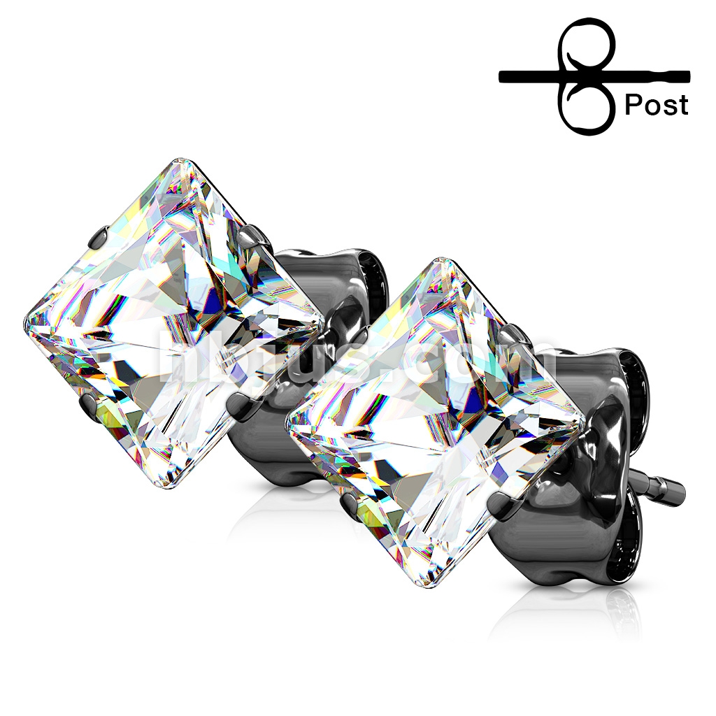Pair of 316L Black IP Plated Surgical Stainless Steel Stud Earring with Princess Cut Clear CZ