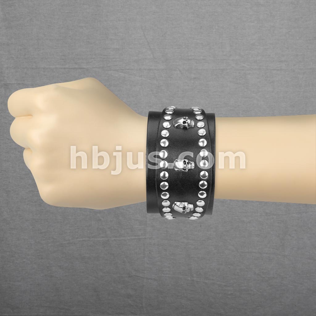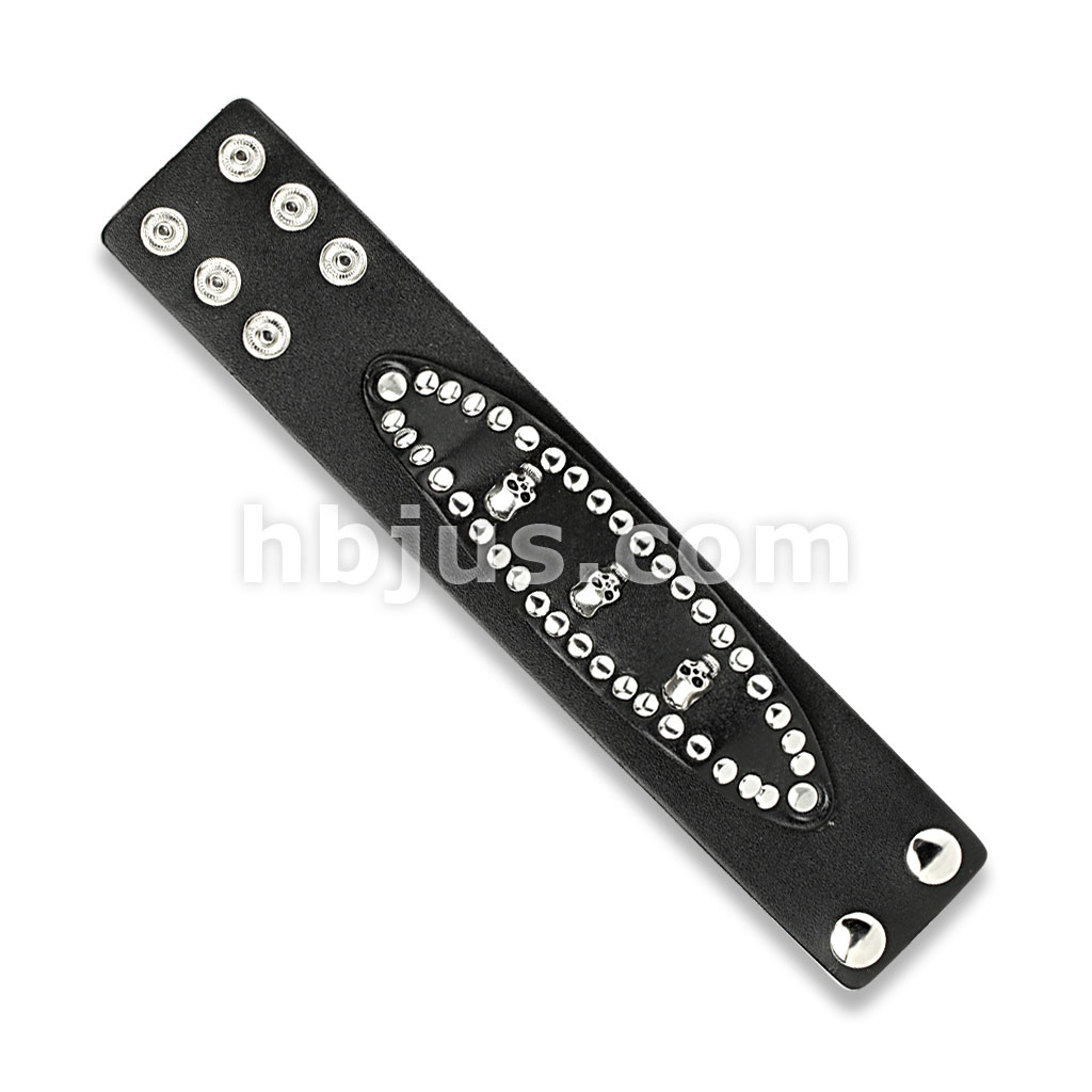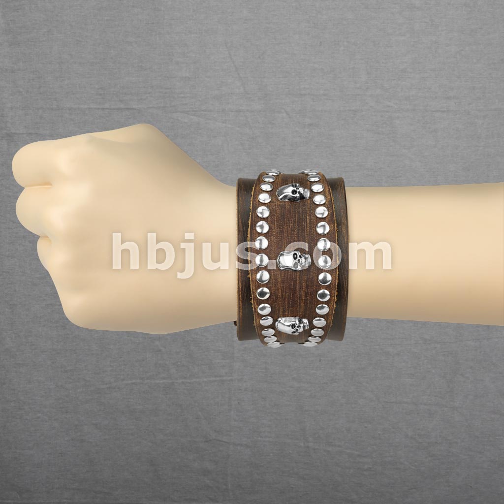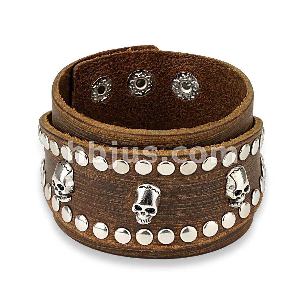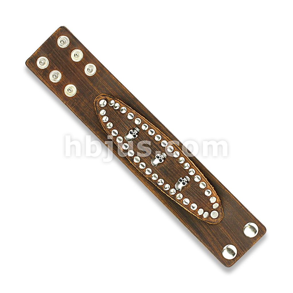 Three Skulls with Studs around Adjustable Leather Bracelets