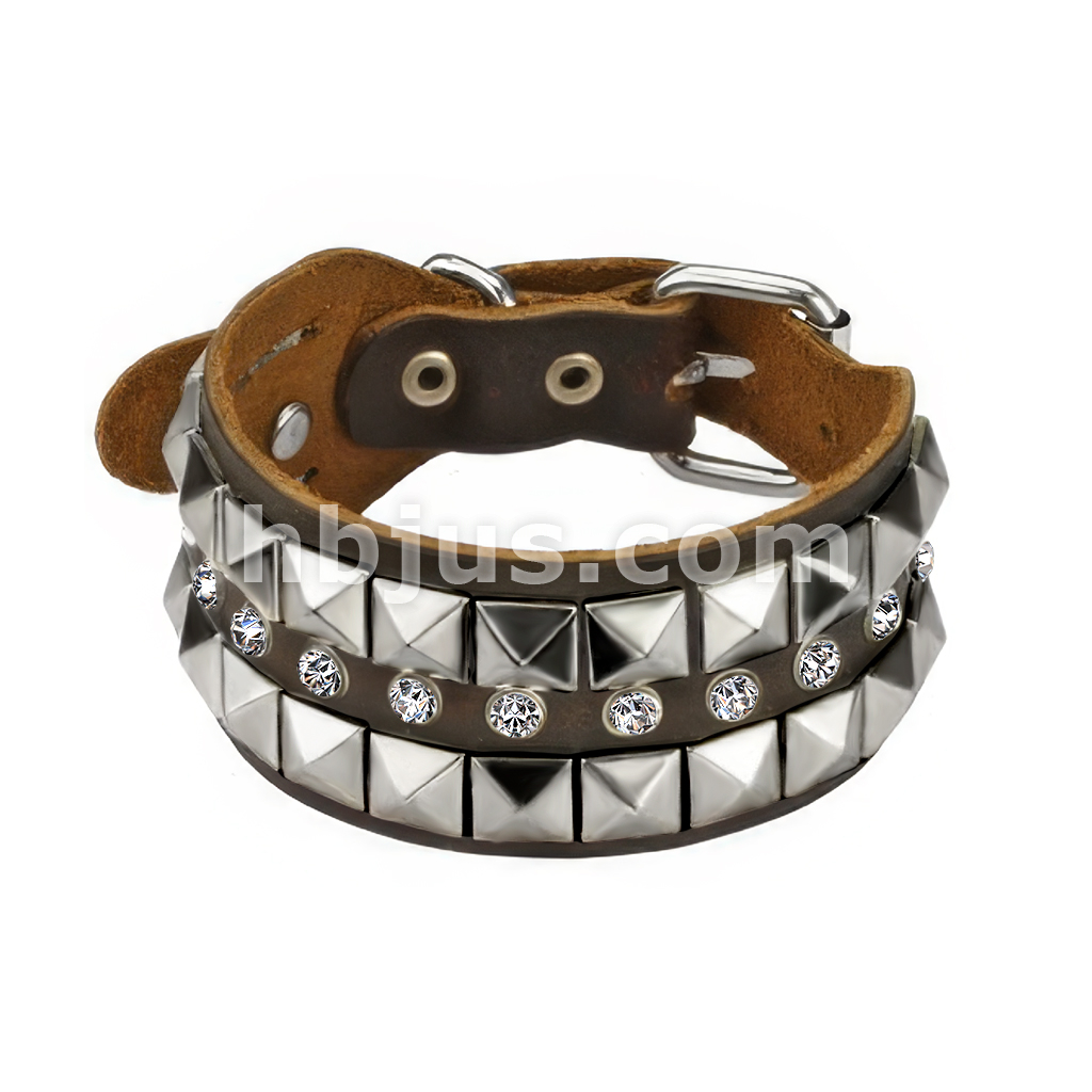 Brown Leather Bracelet with Multi Row Pyramid and CZ Studs