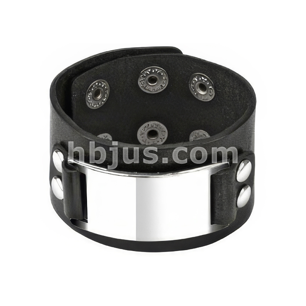 Black Leather Buckle Plate Bracelet with Adjustable Snap Closure