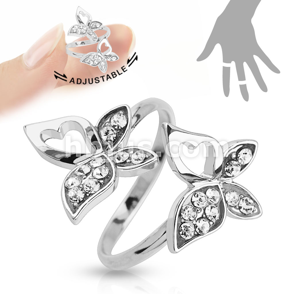 Double Butterfly Multi-Pave Gems Adjustable Rhodium Plated Brass Mid-Ring