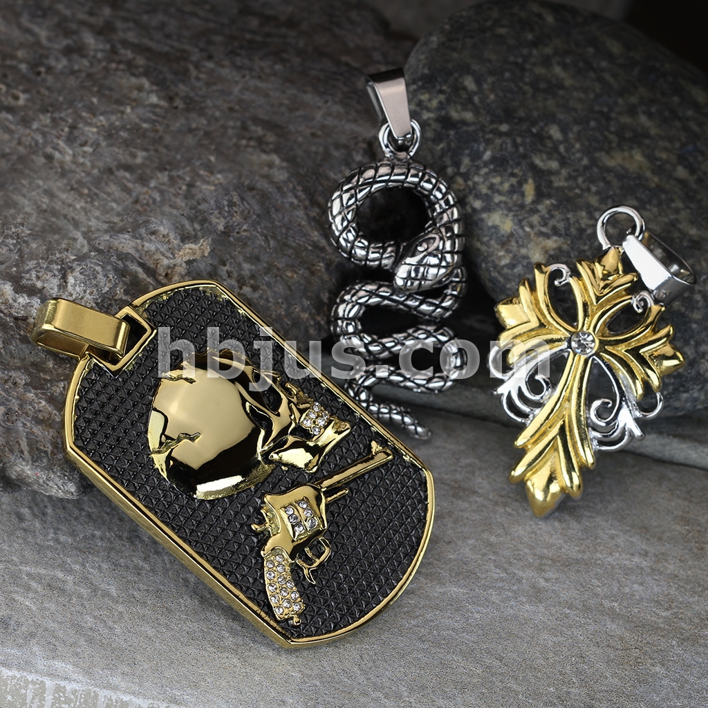 Gold Plated Revolver Pistol Gun and Skull With CZ Accents Dog Tag Stainless Steel Pendant