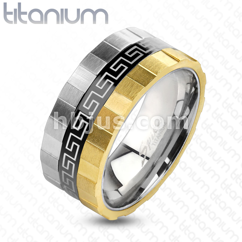 Grooved Edge 3 Toned Maze Design Solid Titanium Ring