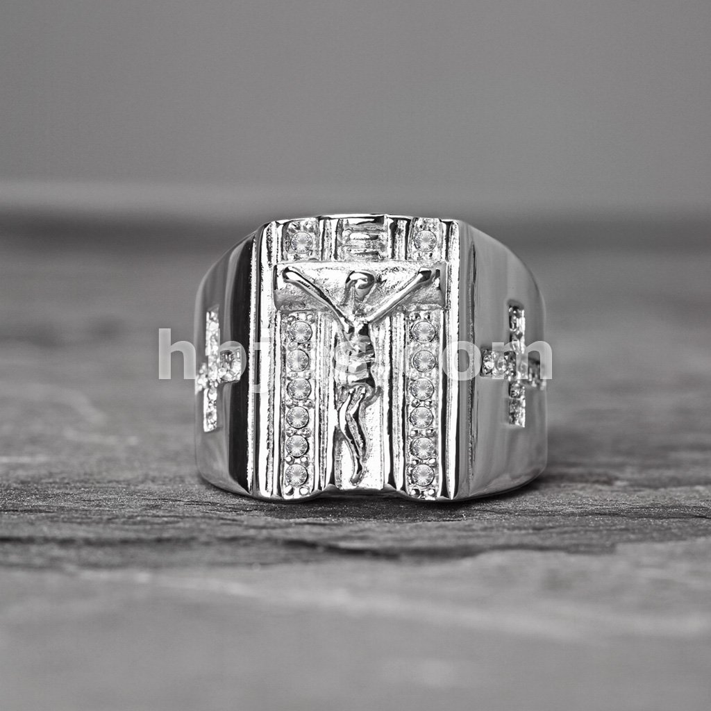CZ Pave Cross Sides and Jesus on the Cross Stainless Steel Rings