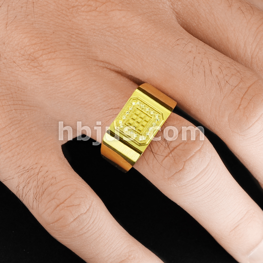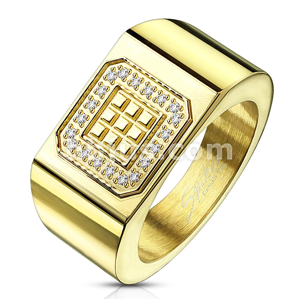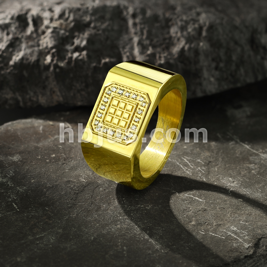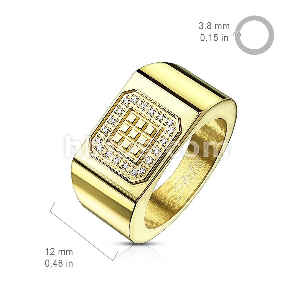 20 CNC Machine Set CZ Outlining Square Blocks Gold IP Wide Stainless Steel Ring