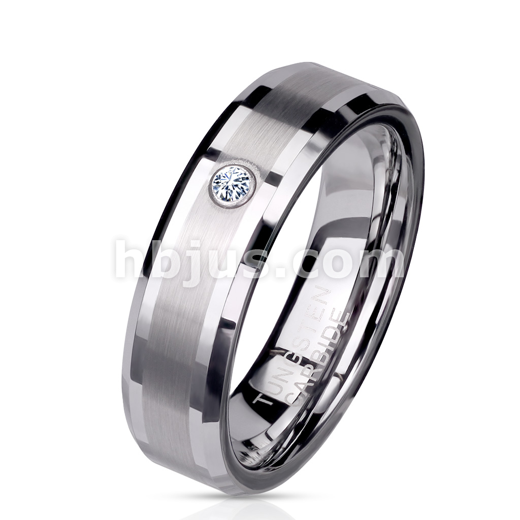 CZ Set Brushed Center Beveled Edges Tungsten Carbide Rings
